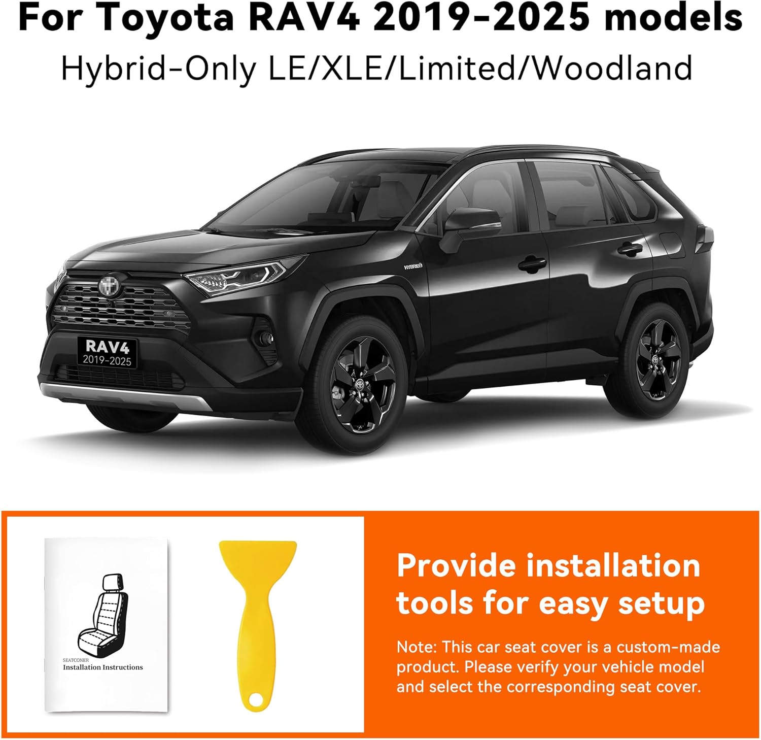 | Special Features | Cleaning Method:Wipe with Damp Cloth, Fit Type:Custom Fit for Toyota RAV4 2019–2025 Hybrid-LE/XLE/Limited/Woodland, Intended Use:Seat Protection, Interior Upgrade, Family, Pets, Rideshare, Package Includes:Front and Rear Seat Covers, Headrest Covers, Installation Accessories, Seat Compatibility:Compatible with Airbags and Heated Seats |