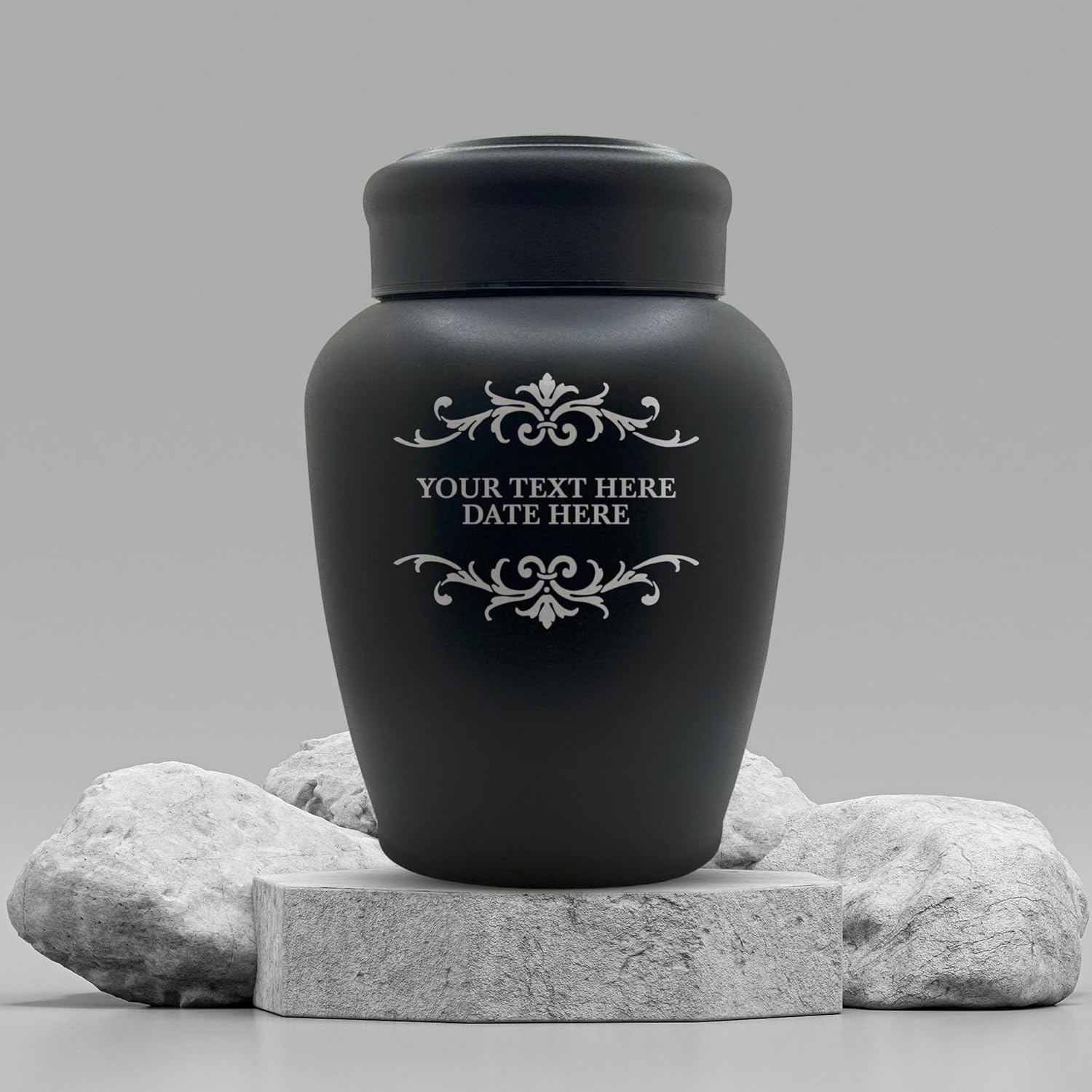Crafted with care and dignity, our Personalized Custom Human Cremation Urn for Adult Ashes is a lasting tribute to the cherished memories of your loved ones. This meticulously designed urn is tailored for those who weighed up to 150 lbs, offering a fitting resting place for both men and women. Constructed with premium stainless steel, the urn boasts a sleek black finish that exudes elegance and sophistication. This urn is an affordable option for smaller individuals who weighed up to 150 Lbs The threaded lid closure adds an extra layer of security, sealing the urn and safeguarding the contents within. The lid, with a width of 4.5 inches, ensures easy access for placement and retrieval of ashes, while maintaining a secure and discreet closure. Designed with precision, the dimensions of the urn stand at a height of 8.2 inches, a width of 6.5 inches, and a bottom diameter of 4.25 inches. These proportions create a harmonious balance, ensuring the urn serves as a timeless and tasteful memorial. The personalized touch is added through custom engraving in silver/steel, featuring the name and date of your loved one. This enduring tribute captures the essence of their life and leaves a lasting impression on those who hold their memory dear. Honoring your loved one's legacy, our Custom Human Cremation Urn is a beautiful and dignified choice for commemorating a life well-lived. May it bring comfort and solace as you cherish the memories of your dearly departed.