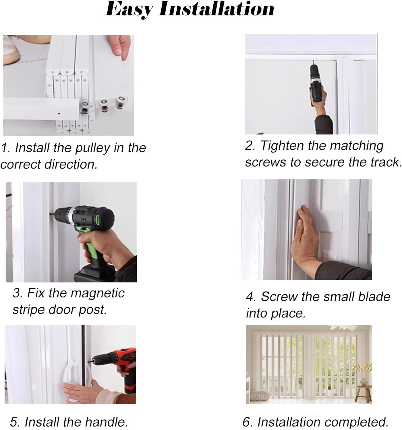 Metal Frame Indoors Security Patio Door:Transform your space effortlessly with our versatile accordion door, perfect for enhancing various areas such as living rooms, bedrooms, kitchens, and study rooms. This innovative folding door not only serves as a stylish decorative element but also provides effective space separation and privacy. Designed with a space-saving mechanism, our accordion door neatly folds away when not in use, maximizing your available space. This allows you to create a more open and functional environment without sacrificing style. **Specifications:** - **Material:** Aluminum Alloy Upper Track, PVC Door Panel, Plastic Window - **Dimensions:** Customizable Length and Height - **Features:** Waterproof, Thermal Insulation, Easy to Clean **Key Features:** 1. Smooth and effortless operation for easy access. 2. Ideal for controlling pet movement within your home. 3. Simple installation process for quick setup. 4. Versatile usage for pantries, hallways, offices, and balconies. 5. Effectively blocks kitchen fumes and odors, keeping your space fresh. 6. Functions as a stylish divider, concertina gate, or screen. 7. Perfect for small spaces, ensuring privacy without taking up too much room. 8. Equipped with alloy pulleys for silent and smooth operation. 9. Offers full blackout insulation, keeping your home warm in winter and cool in summer. 10. Occupies only 10% of the space compared to traditional doors, making it an excellent choice for smaller areas. 11. An ideal solution for separating spaces like bedrooms from bathrooms or kitchens from living rooms. **Package Includes:** 1× Accordion Door **Note:** Minor size discrepancies of 1-3 cm may occur due to manual measurements and production variations. Color differences may arise from lighting effects; please refer to the actual product for accurate representation. Upgrade your home with our accordion door and experience the perfect blend of functionality and style, designed to enh