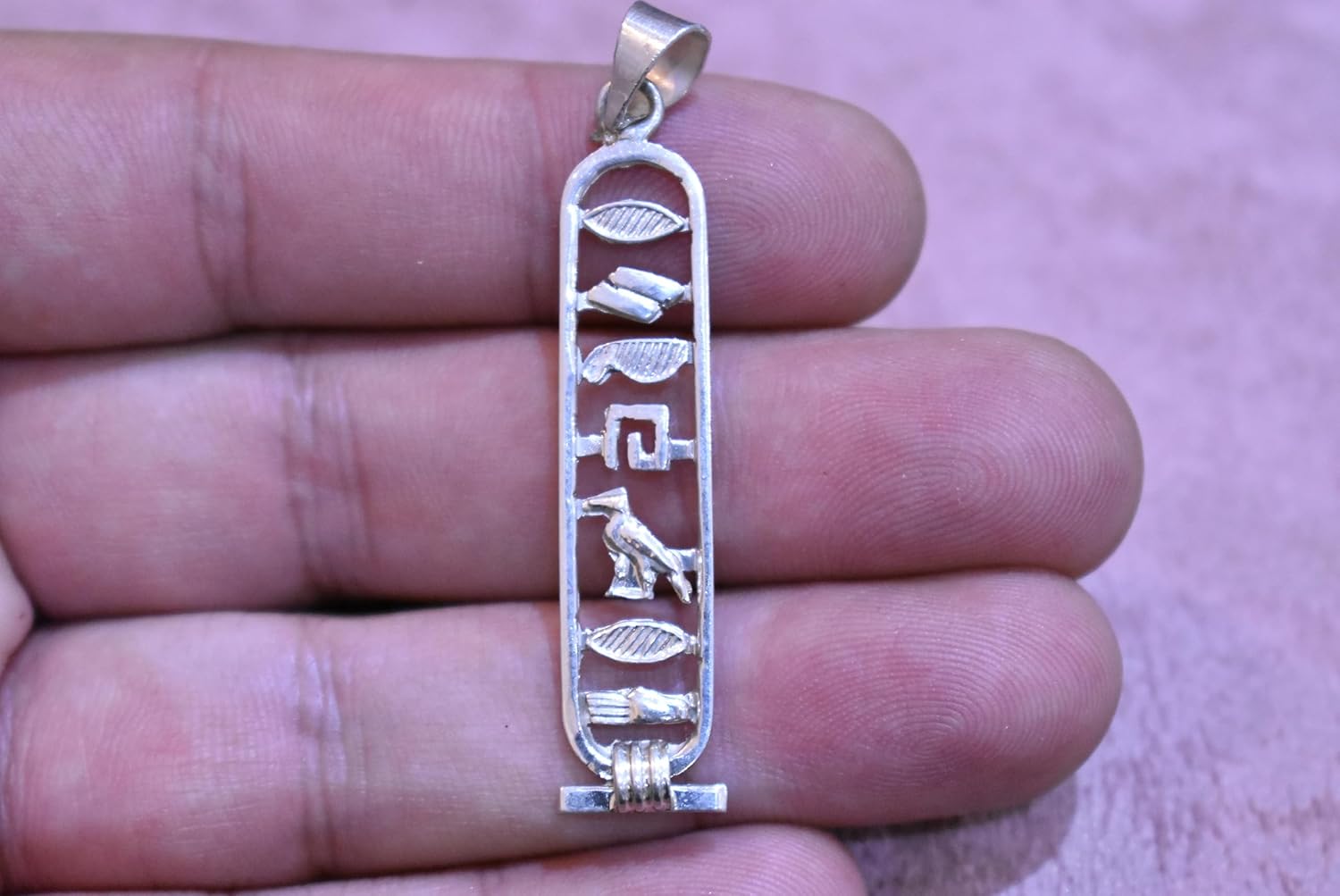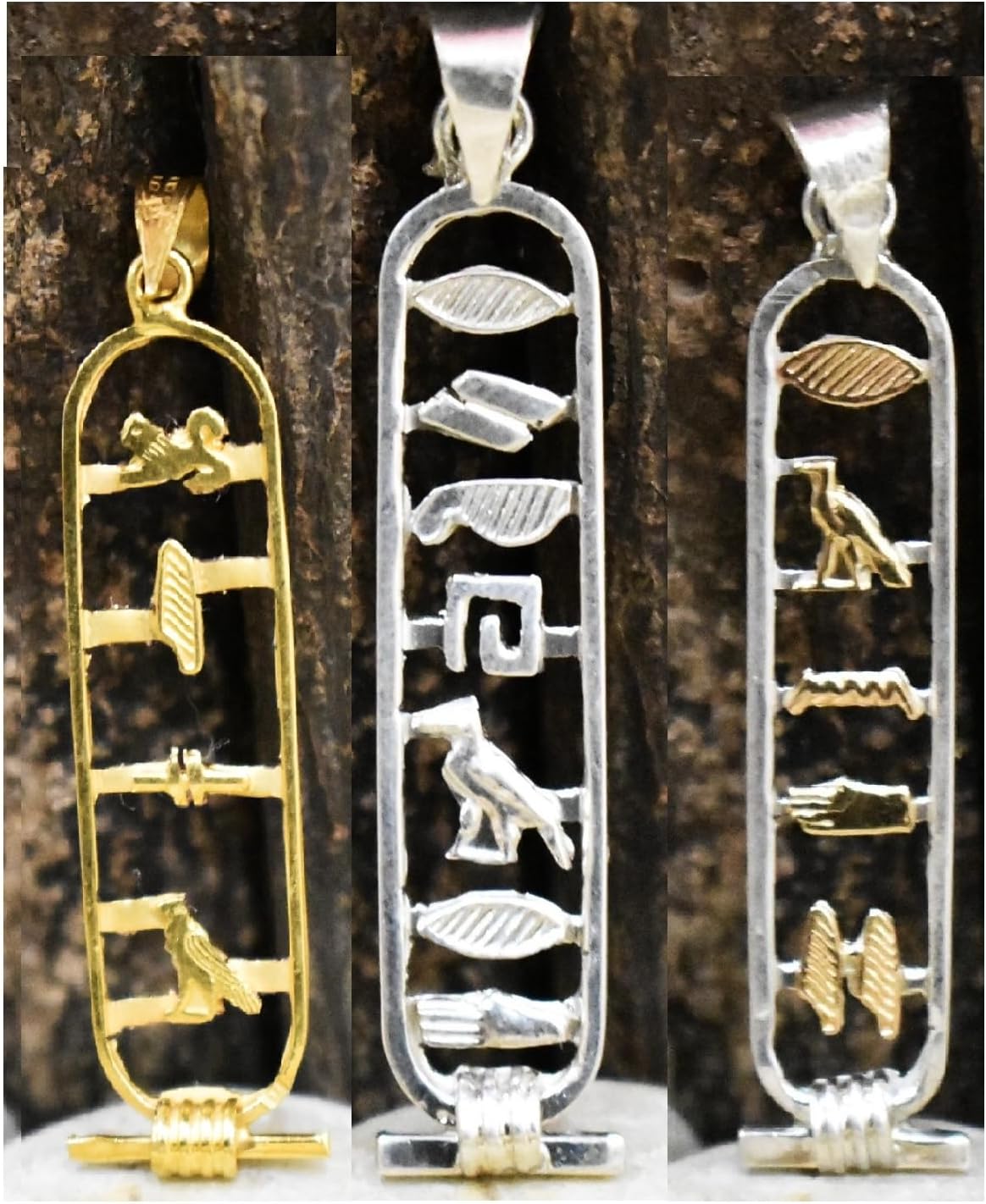 Small Size ( Up to 3 Letters): 1.5" Length,,, Medium Size (4-5 Letters): 1.75" Length,,, Large Size (6-7 Letters): 2" Length,,, XLarge Size (8-9 Letters): 2.25" Length,,, Condition: New; High Quality Hand Made In Egypt. Materials: Hallmarked Solid 18K Yellow Gold Color: 18k Yellow Gold IT IS Tested & SIGNED WITH THE EGYPTIAN Gold Government HALLMARK FOR 18K GOLD to Ensure Authenticity 100% Egyptian hand made *Condition:A brand-new,exactly as on the photos Please note this is Handmade in Khan el Khalili in Cairo, Egypt. Each cartouche is stamped with the Egyptian government's hallmark certifying the metal content. This stamp may appear as a defect but is actually a sign of the pendant's authenticity. It may be on the front or the back, the Egyptian government decides where to place this stamp. The Cartouches were formerly worn by Pharaohs in Ancient Egypt, with their names on it, as an amulet for divine protection and to attract Victory and prospirity.. the cartouche shape was also used to encycle the names of the pharaohs, when they are written written in temples, to indicate that the written name refers to a Pharoh or a Ruler