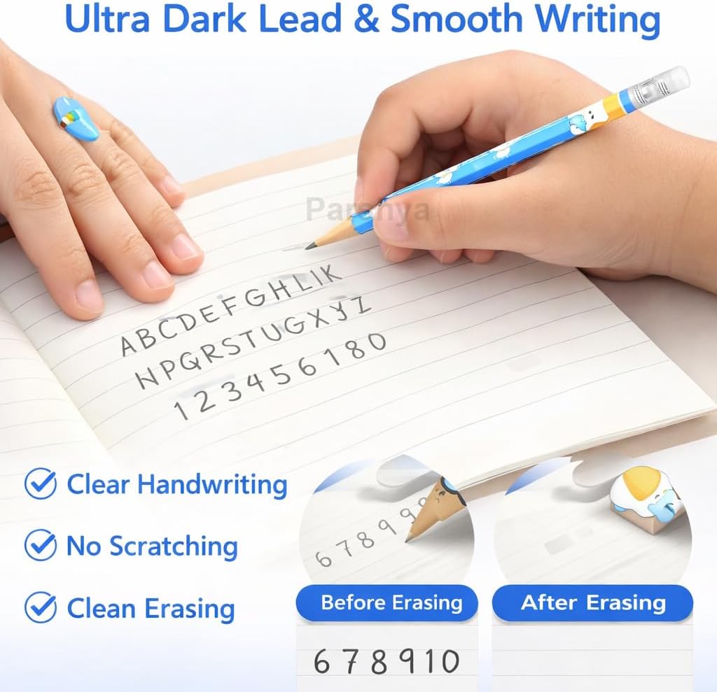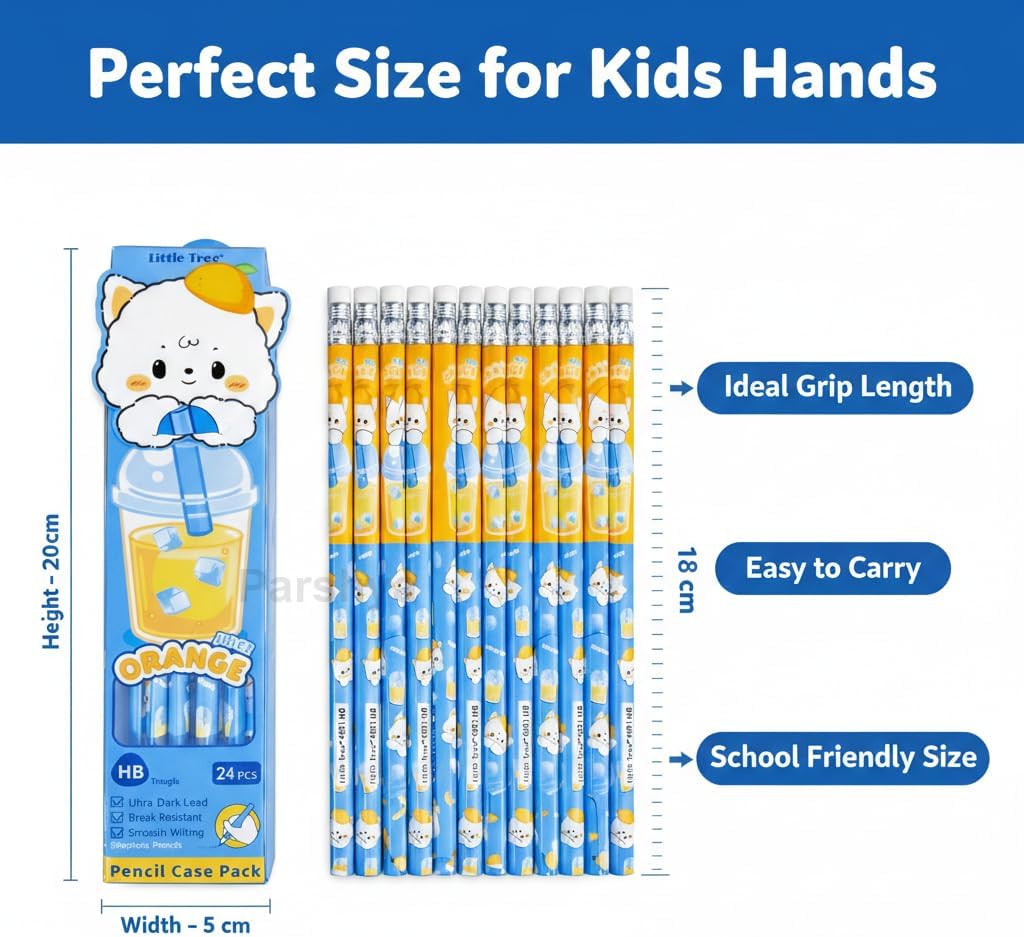 Make learning fun with the Parshya Cartoon HB Pencil Set, specially designed for young learners. This pack includes 24 high-quality HB pencils with a sturdy storage case, making it a complete school stationery solution for kids.The pencils feature a strong graphite core that provides smooth, dark writing and reduces breakage while sharpening. The triangular ergonomic grip helps children hold the pencil comfortably and encourages proper handwriting habits.Made using non-toxic, odor-free materials, the pencils are safe for everyday use. The adorable cartoon design keeps children excited about studying, writing and drawing.Perfect for:✔ School use✔ Homework✔ Art & drawing✔ Handwriting practice✔ Birthday return gifts✔ Back-to-school suppliesA practical and thoughtful gift for students, preschoolers and primary school kids.Writing Grade: HBQuantity: 24 PencilsShape: Triangle GripMaterial: Wood + Graphite CoreSafety: Non-Toxic PaintAge Group: 3+ YearsUse: School, Drawing, Writing, GiftingIncludes: Storage Pencil Case