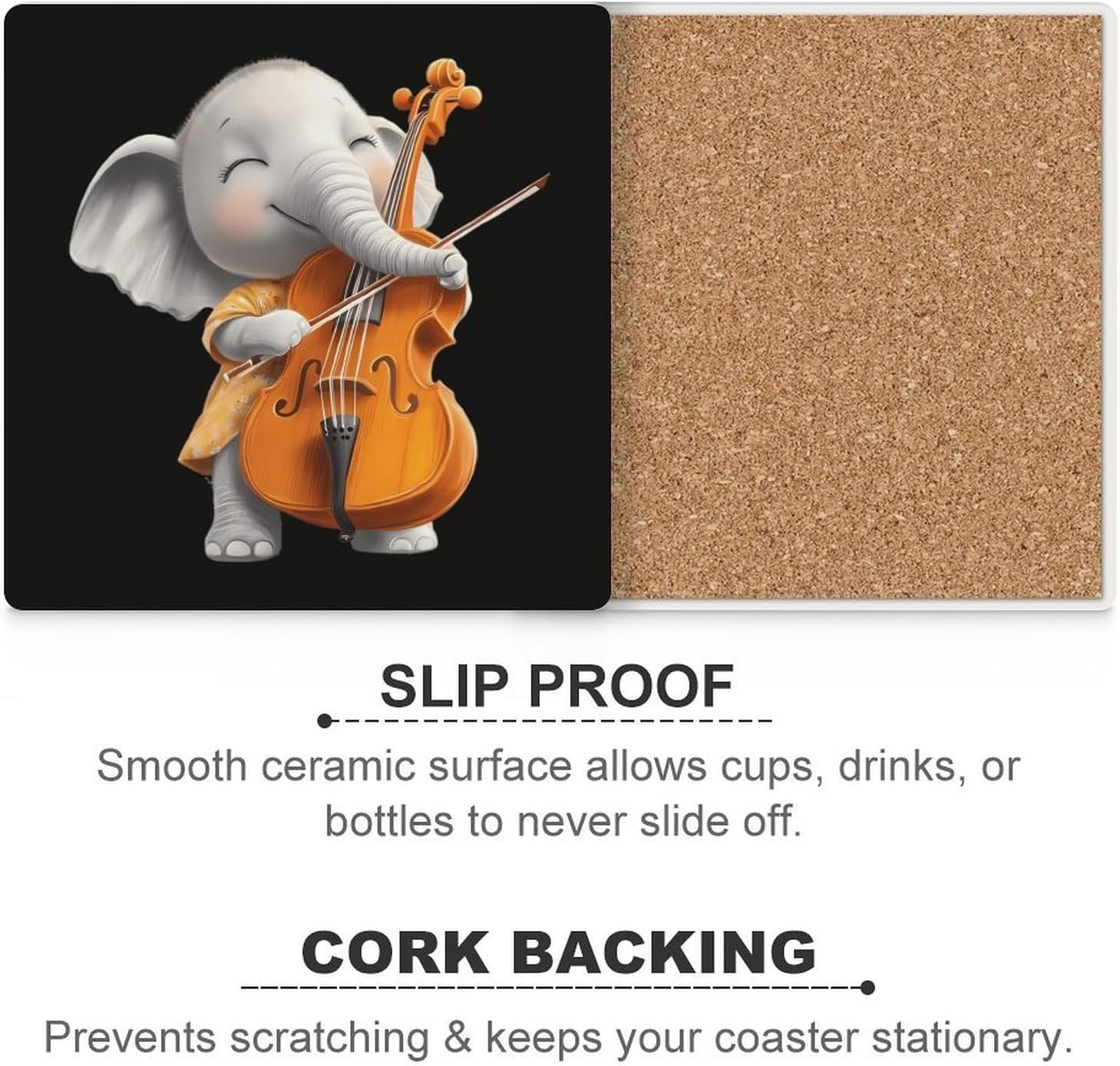 Cute Elephant Playing Cello Funny Ceramic Coasters for Drinks Absorbent Cup Holder Tabletop Protector with Cork Base