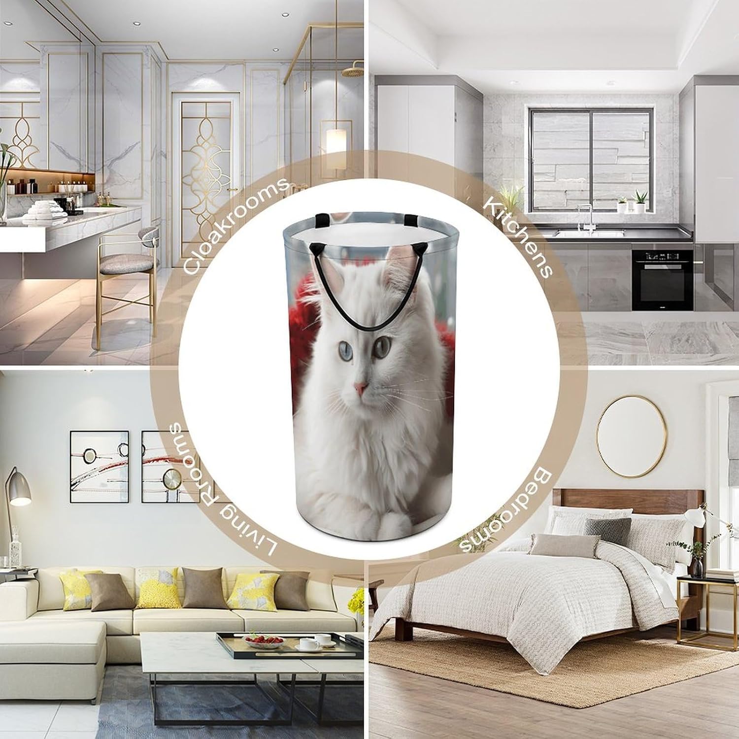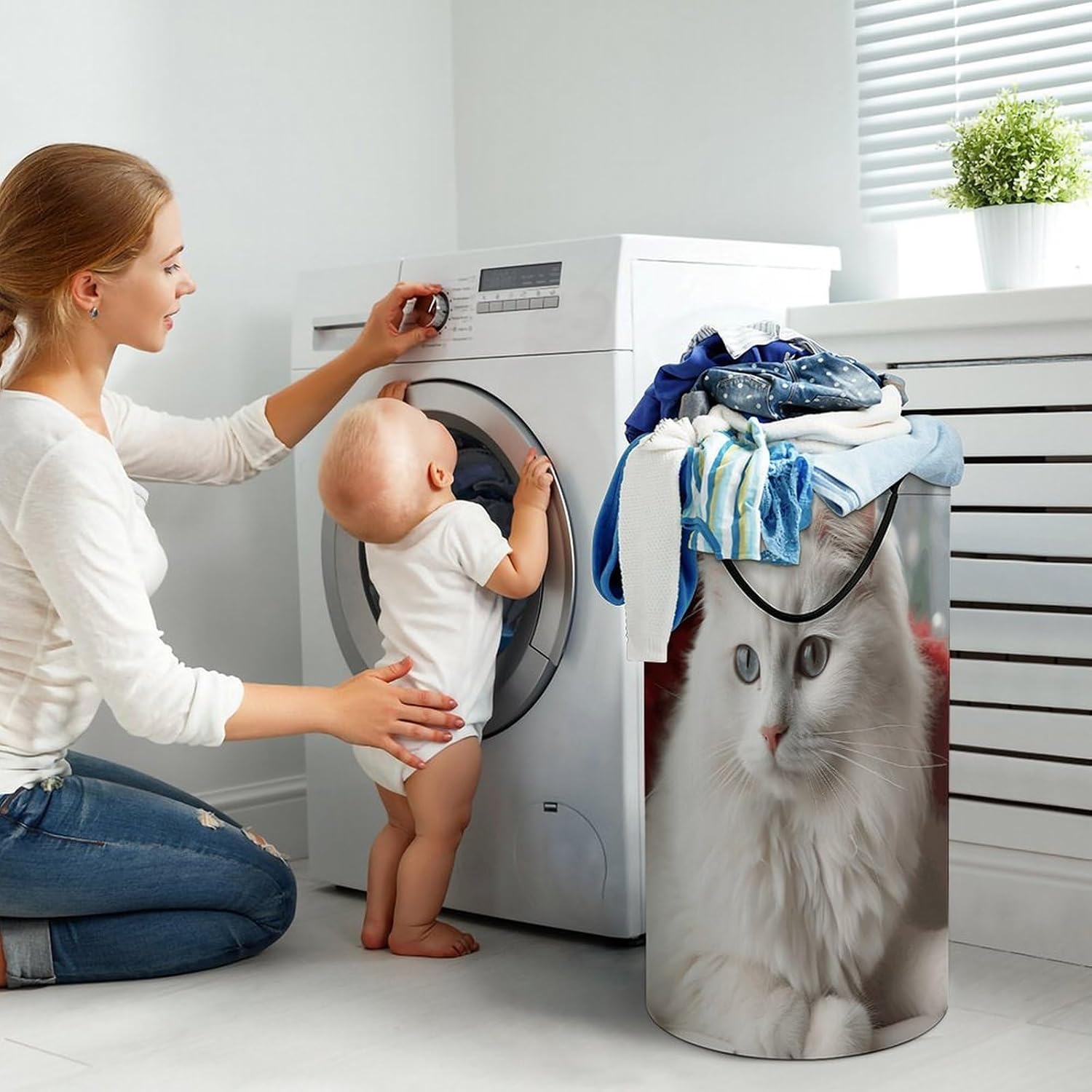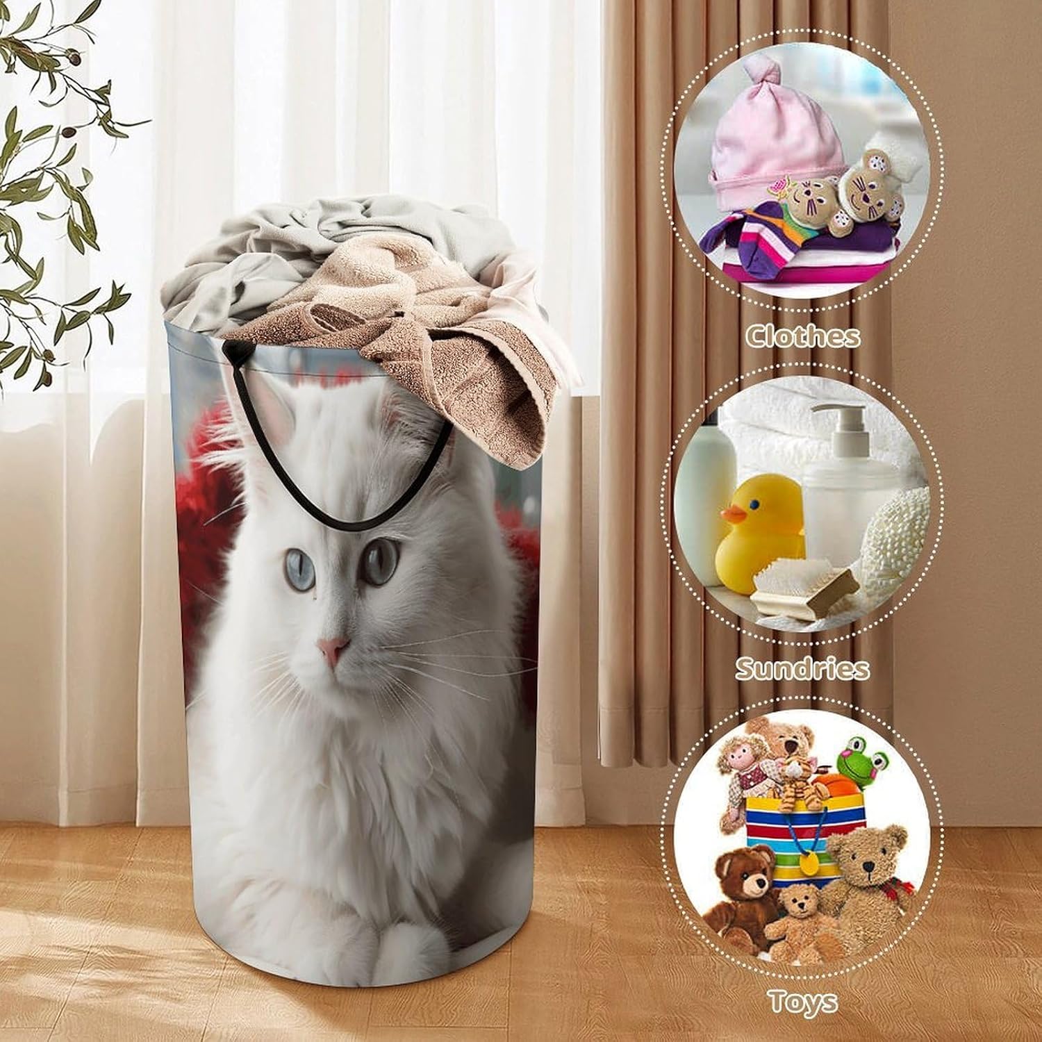 The pattern of the Cute White Cat hamper is printed with exquisite patterns, which makes the product more attractive.Chic design allows it to be used in the living room to hold throw blanket, pillows, and reading materials, as well as in the bathroom for towels, or as a laundry hamper.The laundry hamper adopted collapsible design, equipped with handles. It is lightweight and portable for using, storing, and moving conveniently.Cute White Cat Clothes hamper is suitable to store dirty clothes washing, place in the room to store toys, and other household goods, keep the house clean and tidy. Perfect laundry hamper for home, office, closet organizer, bedroom, bathroom, college dorm, etc.Gets out of your way when you need it to. This storage basket or laundry hamper is a good gift, which not only meets everyday storage needs but also carries deep care and love, a perfect way to turn thoughtfulness into warmth.