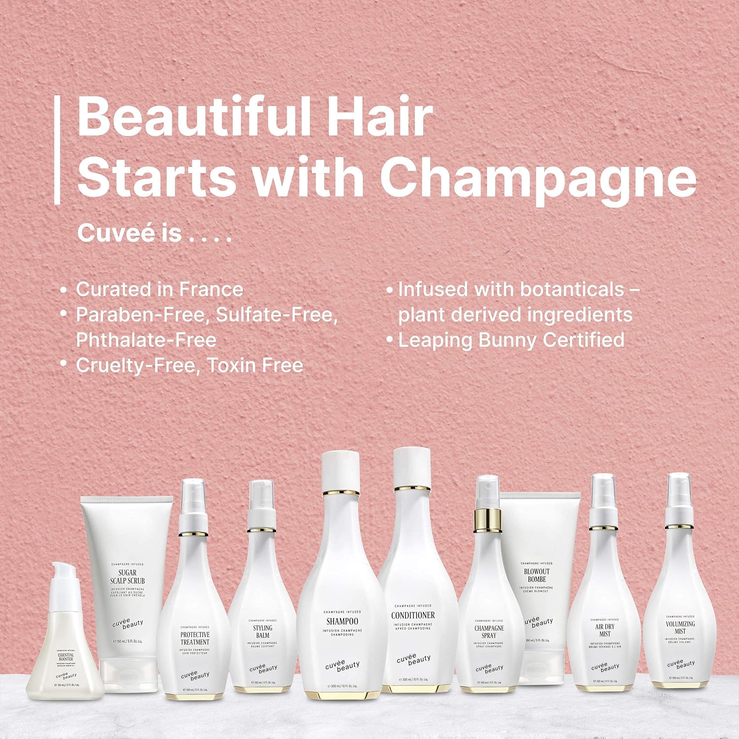 One can certainly expect strength, softness, and shine from our champagne-infused shampoo that gently cleanses hair without stripping essential oils or color. An elite Cuvée Complex highlighting our exclusive amalgam of premium skincare components helps foster a healthy scalp, making the foundation to a healthy head of hair. Vitamin B and Panthenol help restore and preserve from roots through ends. Hair feels stronger and softer, looks shiny, and refreshed after every luxurious wash. An exclusive Cuvée Complexfeaturing our proprietary blend of premium skincare ingredients helps promote a healthy scalp, forming the foundation for a healthy head of hair. Deliciously scented with our intoxicating Cuvée fragrance featuring champagne and fig leaf notes with Leaping Bunny Certified. Cuvée Beauty Shampoo will: Add smoothness to your hair Promotes healthy, strong hair Enhances shine Revitalize dry & damaged hair Ingredient Spotlight Champagne Extracts including Grapeseed Extract - Known to encourage hair growth, restore strength, and shine. Hydrolyzed Collagen - Helps in providing strength and flexibility to your hair. Amino Acids - Produces red blood cells that supply nutrients and oxygen to hair follicles, thus facilitating hair growth. Keratin - Helps in soothing and strengthening down your hair which helps in making your hair look fuller and glossy. Panthenol/B5 - Binds the hair follicles and coats and seals in moisture which prevents dry hair and scalp How to Use: Apply Shampoo into wet hair. Lather well, massaging into the scalp through strands. Rinse thoroughly. For best results, follow with Cuvée Beauty Conditioner.
