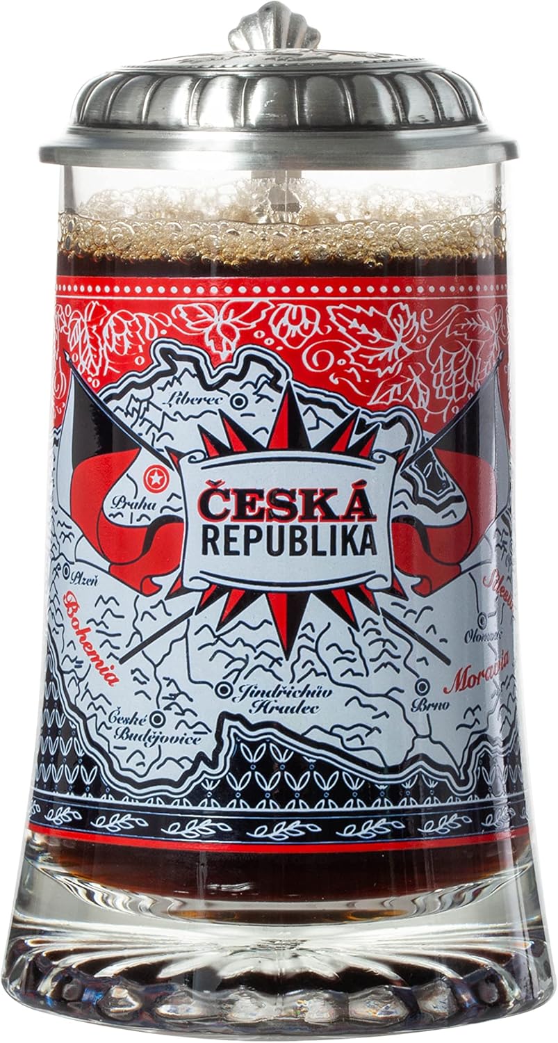 Premium German-style glass stein that will add sophistication to your beer drinking experience. This glass stein is decorated with a high-fired design that was created by artist Nora Wildgen. It features red, white, and blue colors of the Czech Republic, along with a map showing major cities and regions, and four detailed vignettes highlighting the Czech Republic's brewing and cultural history. The pewter lid of the stein is decorated with an image of the Czech national emblem of the two-tailed lion. The stein can be used to consume your preferred beverage or as a beautiful piece of home décor. A must have in any collection!