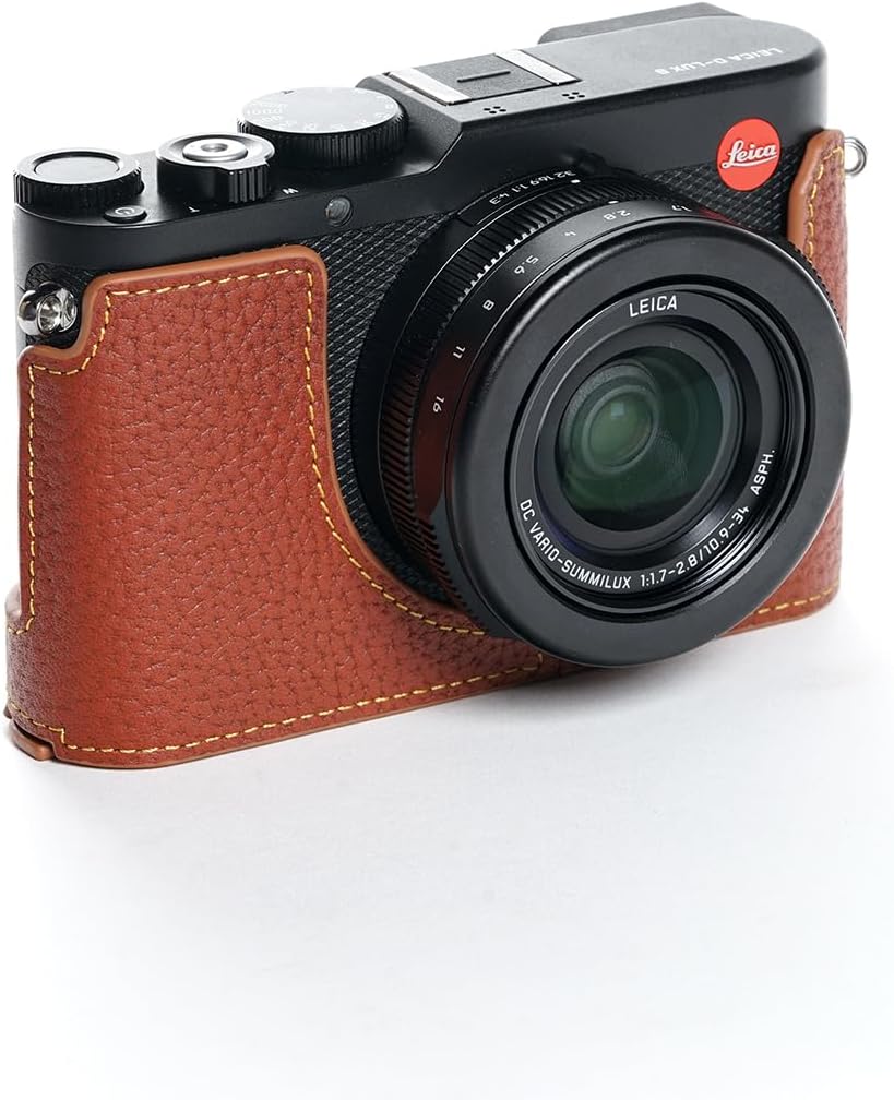This camera is made by real top layer oil leather, the design is simple and vintage, use Metal sizing techniques make it very fit with the camera body. Inside lining use high lever velvet to protect camera body for scratch and coloration. There is a opening on the bottom for battery, You don't need to take off the half case when you change battery. Under base screw is made by copper and it can easy take off by coin. You don't need to take off the half case when you use tripod. It has a special design for Leica D-Lux 8 Camera which makes it easy to turn over the Screen and it will totally not affect screen rotation. You don't need to take off the half case when you connect data lines. Content: 1 x camera half case, 1 x Free Genuine Real Leather Hand Strap, camera not included. Material:Genuine leather.