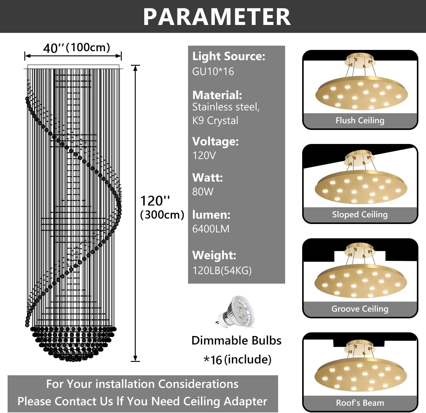 D40'' x H120'' Crystal Chandelier High Ceiling Chandeliers for Staircaes Large Raindrop Chandeliers LED Dimmable Flush Mount Light Fixtures for Foyer Hallway Entryway LED Bulbs Included Gold