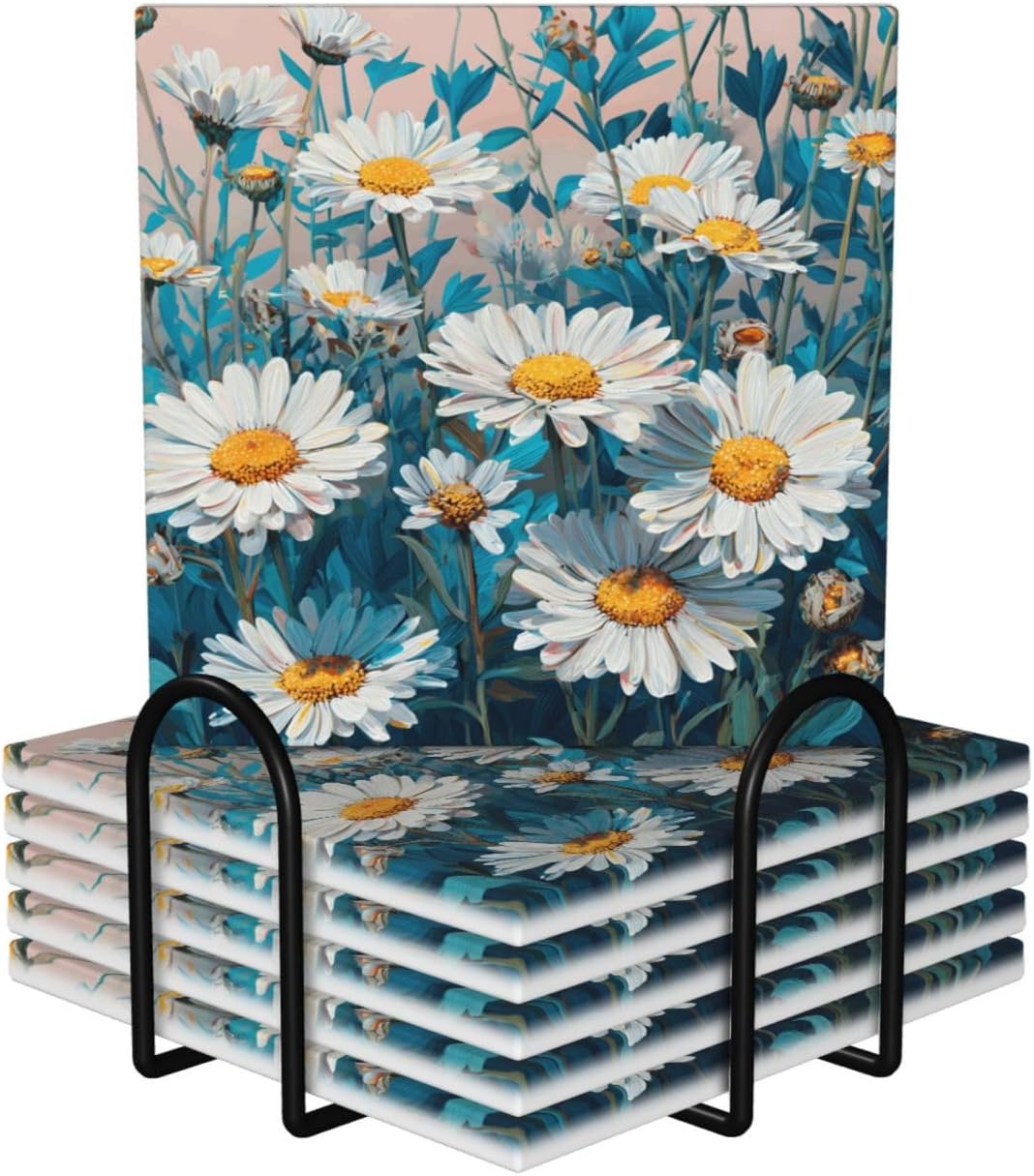 Product Name: DCEHGEW Ceramic Drink CoastersMaterial Type: Ceramic with cork bottomSize: Round: 4.1 x 4.1 inches, Square: 3.9 x 3.9 inches, Hexagon: 4.3 x 3.7 inchesPattern: Daisy About Our Ceramic Absorbent Coasters:Product Features - Crafted from high-quality ceramic, these coasters are odorless and eco-friendly. Their superior absorbency keeps your surfaces dry by quickly soaking up spills from coffee, cola, and other beverages within 10-15 seconds.Applicable Scenarios - Perfect for adding a stylish touch to your kitchen, living room, bar, hotel, or restaurant. These coasters are an ideal present for birthdays, Mother's Day, Father's Day, Valentine's Day, anniversaries, housewarming celebrations, or Christmas.Accessory Structure - Each set includes 6 ceramic coasters with cork bottoms, accompanied by a sleek black metal stand for organized and aesthetic storage. Choose from three different shapes to suit your style and needs.Washing Instructions - Easily clean these coasters with water or a damp cloth.Special NoteDue to different measurement methods, a deviation of up to 0.3 cm in size is considered normal.Please Note:The product images are for reference only. Actual products may vary slightly due to production factors such as batch differences and machine settings. Minor variations in color, position, and size are normal and not considered defects. Thank you for your understanding!Customer Service:We want to make sure you have an amazing experience with us. Please contact us with any feedback you may have. We love to hear from you and usually respond within 12-24 hours.