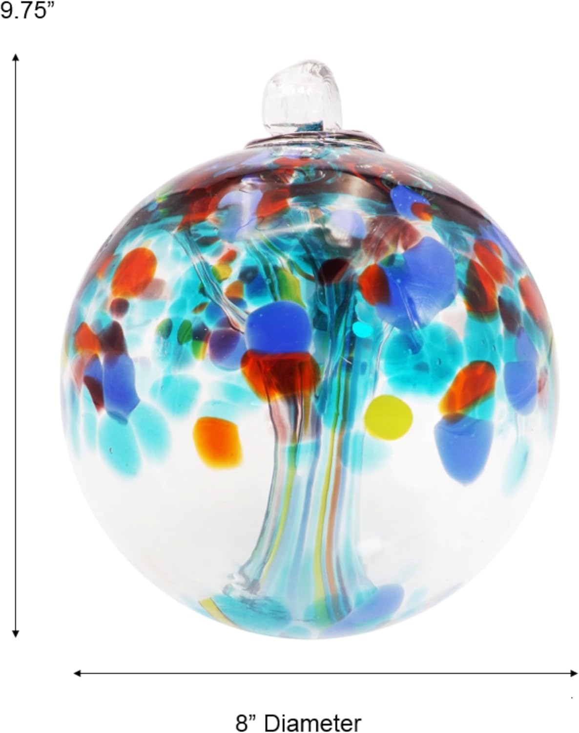 The Dale Tiffany brand strives to keep abreast of the latest home décor trends. As a result, we are pleased to present our Rainbow Tree of Life Collection. The collection features an impressive array of Hand Blown Art Glass Balls in a variety of sizes and colors to suit every taste and décor. They are an effortless way to add a splash of color to any home, inside and out. Each Ornament is painstakingly hand blown with tree trunk inside. Each ball includes a clear glass loop at its top to facilitate hanging in any of the available stands, hangers, and garden stakes. Our hand blown process embeds color within the glass itself, which means that no 2 pieces are exactly alike and ensures yours are a dazzling one of a kind 3,dimensional art piece you will proudly display in your home or garden for many years to come. Due to the nature of handcrafted art glass; colors, sizes and patterns may vary slightly. (Stand or Metal Hanger Not Included) For best hanging method, aircraft cable wire is suggested.