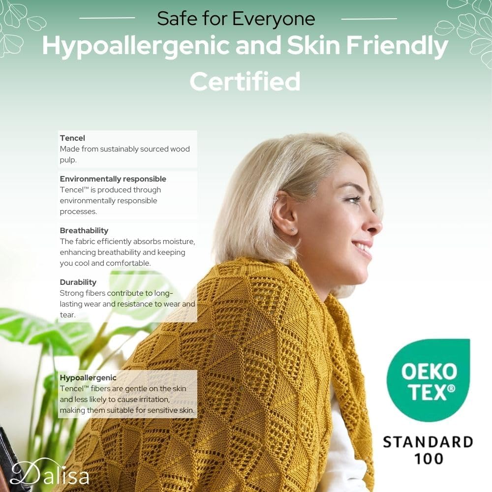 | Additional Features | [100% TENCEL™ LUXURY] Crafted from TENCEL™ fibers sourced from sustainably harvested eucalyptus trees by Lenzing AG in Austria, this blanket offers unmatched softness, breathability, and eco-friendliness. Unlike traditional fabrics, TENCEL™ provides superior moisture management and a smooth, silky touch, setting it apart as a premium choice., [GIFT-READY PRESENTATION] Comes beautifully packaged in a reusable gift box, offering a distinctive edge for those looking to give a thoughtful, sustainable, and luxurious gift. Unlike standard blankets, this product is ready for gifting without the need for extra wrapping., [OEKO-TEX CERTIFIED FOR SAFETY] Certified by Oeko-Tex Standard 100 Class 1, this blanket ensures the highest standards of safety, making it ideal for sensitive skin. This certification guarantees it is free from harmful substances, offering a feature that many competitors cannot match., [SUSTAINABLE MANUFACTURING] Proudly made in Türkiye at Evteks' next-generation sustainable factory, this blanket stands out with its low-impact production process. The factory focuses on energy efficiency, waste reduction, and ethical practices, ensuring a product that’s kind to the planet., [VEGAN LEATHER LABEL & ELEGANT DESIGN] Features a sophisticated vegan leather label and a boho crochet lace pattern, making it not just a blanket but a stylish accent piece for your home. These unique design elements provide a modern and ethical touch that is rare among comparable throw blankets. |