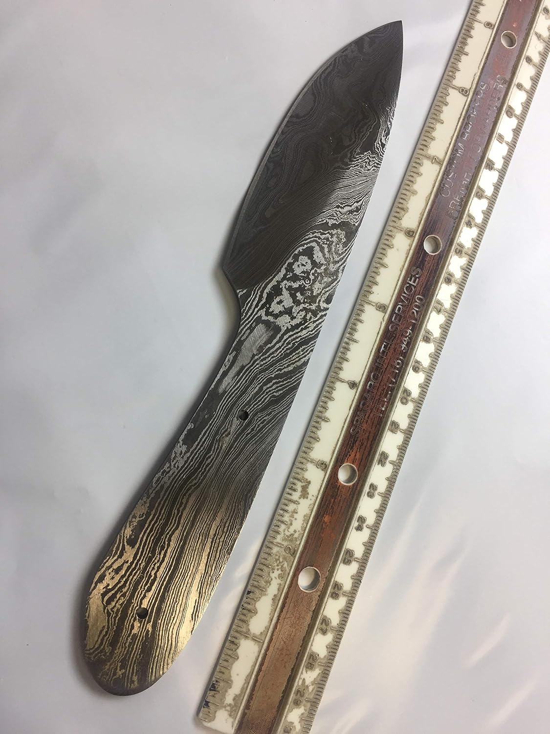 Features: 4 pieces Damascus steel full tang blade skinning knives set Overall 33 inches Damascus steel blade. Hand forged twist pattern Damascus steel blank blades. Contains: a) 8.5" long knife with 4.5" cutting edge. clip point blade with 3 pins and a Mossaic hole. b) 8.5" long skinning knife with 4" cutting edge. 6 pin holes and a Mossaic pin space. c) 7.5" long skinning knife with 3.5" cutting edge. Holes for 3 pins and a mosaic. d) 9.5" long skinning knife with 5" cutting edge. Holes for 2 pins. Full tang blades are considered stronger and durable then non full tang Approximately 3 mm Thick Twist pattern Damascus steel clip point blade. Up to standard skinning and Pocket Knives. Blade is made of Damascus steel by forging the 1095 and 15N20 high and low carbon steel Our Damascus steel is prepared by forging over 465 layer of high carbon and low carbon steel. Blade has been given an excellent heat treatment to get it well hardened. Hardness 56 to 58 HRC. Tips to Care Damascus knife: Damascus steel as well as 1095 high carbon steel knives are different than some other common steel knives because of its high carbon content they can be rusted if not care properly. If you have seen rust accidentally then use WD40 to remove it. Never store your knife for long time in leather sheath. Leather can absorb water which will rust the knife. Always clean the blade after using and apply oil or wax (please use cooking oil on Chef Knife) before you store it, for its longer life and durability.