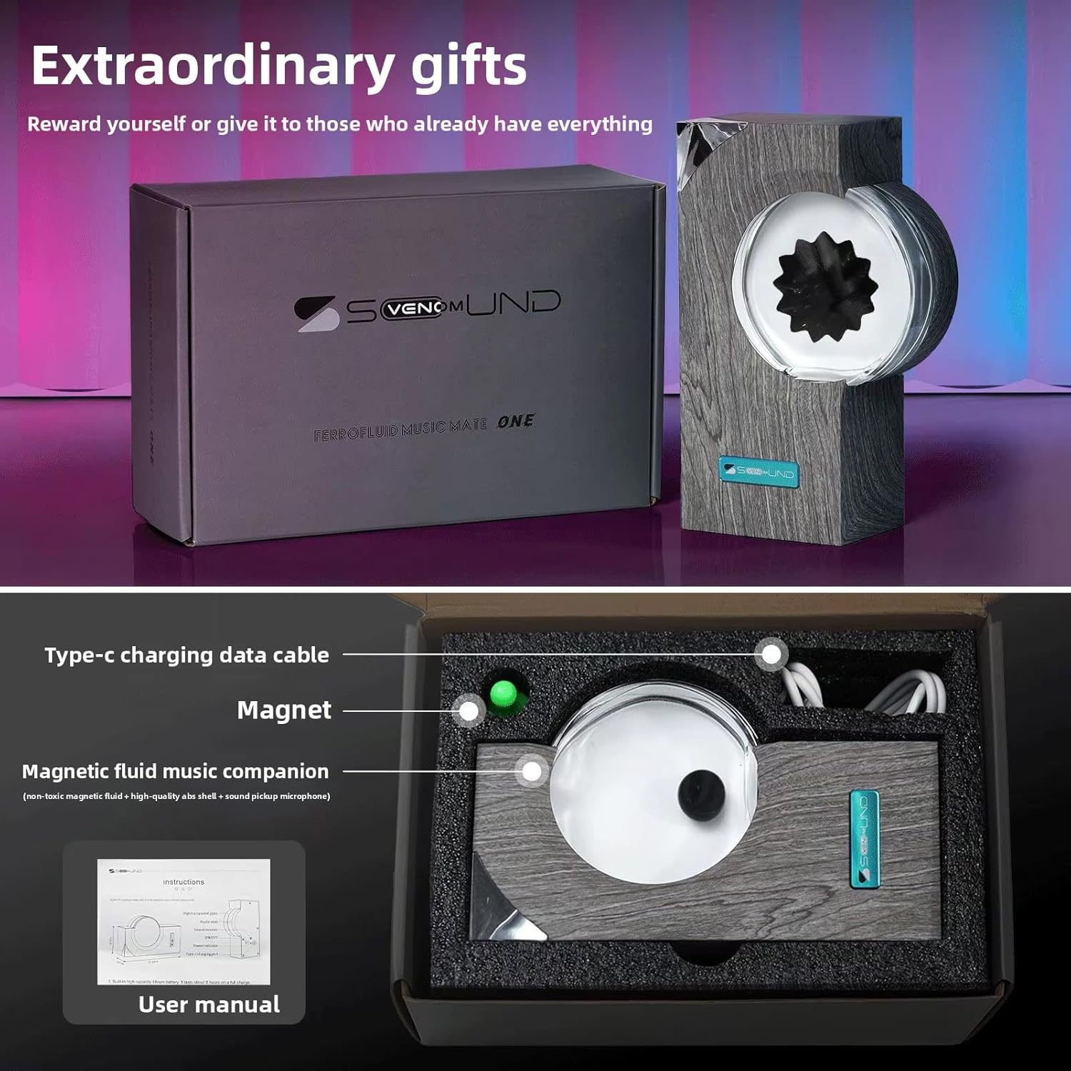 Audio is input by picking up. The ferrofluid rhythm lamp operates in two modes: powered by a built-in lithium battery or via a charger. It all works. Short press the power button (1 second) to power on, long press the powerbutton (3 seconds) to power off. When the ferrofluid is granular, absorb it manually using the included magnetattachment to agglomeration it. Specification: Color: Yellow/Grey Power: 10W Power Input: 5V2A Liquid Tank Capacity: 100ML Battery Capacity: 4000mAh Product Size: 172 x 106 x 54mm Charging Duration: Approximately 8 Hours Packaging Weight: 855g Package Include: 1* Symbiote in a Bottle