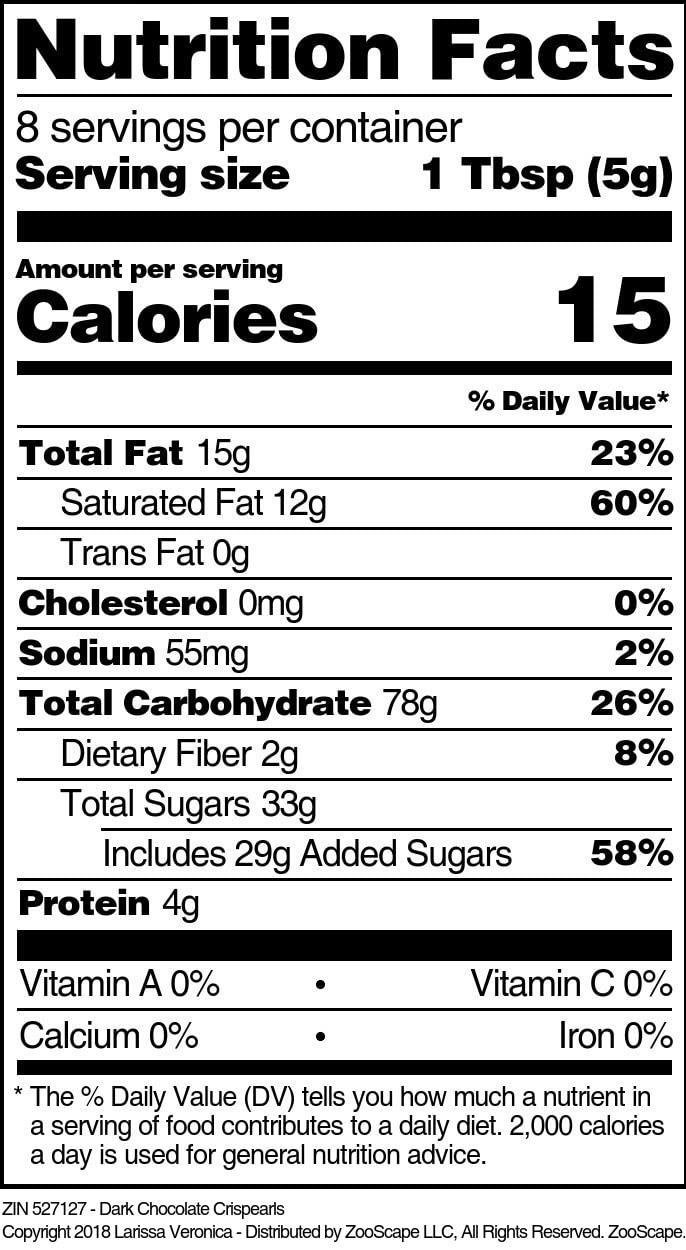 Our Dark Chocolate Crispearls are a delicious way to add an elegant touch to puddings, cookies, mousse, cupcakes, ice cream, cakes and much more! Our crispearls have a toasted crunchy biscuit center which are smothered in a dark chocolate covering. These crunchy pearls are 2-3 mm in size. Enjoy! - Larissa Veronica is an exclusive line of natural premium-quality products that use only the purest and finest ingredients from around the world. Larissa Veronica is hallmarked by the highest possible standards of purity, stability and freshness. All of our products are prepared with the highest elements of quality control, from raw materials through the entire manufacturing process, up to and including the moment that the bottles or bags are sealed for freshness and shipped out to you. Our highest possible standards are certified by independent laboratories and backed by our personal guarantee. - Larissa Veronica strives to make all products affordable and we are constantly researching the market to maintain our affordability and to look for new ways to serve you and the ones you love. Larissa Veronica has become a trusted household name for many families. - Larissa Veronica is packed in tamper-proof, food-grade, recyclable containers. - ZooScape is proud to be the exclusive distributor of all Larissa Veronica spices, snacks, foods and ingredients in the United States, Canada and around the world. - Store in a dark, cool place. Product of U.S.A.