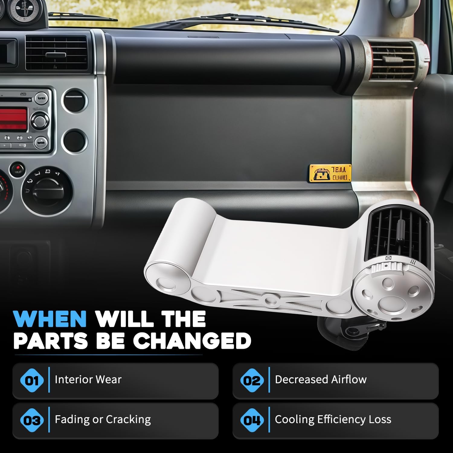 Part Name:Pair Air Vent Register PanelsBrand:PasanguiLocation:Console air vent panelReplace Part Number:55650-3508155650-35080 55650-3513155660‑35130Product Material:PlasticColor:Silvery whiteWarranty: 1 YearFitment:Fit For Toyota FJ Cruiser 2007Fit For Toyota FJ Cruiser 2008Fit For Toyota FJ Cruiser 2009Fit For Toyota FJ Cruiser 2010Fit For Toyota FJ Cruiser 2011Fit For Toyota FJ Cruiser 2012Fit For Toyota FJ Cruiser 2013Fit For Toyota FJ Cruiser 2014Advantage:High Quality Materials:These air vent panels are made of high-quality plastic that is lightweight, corrosion-resistant, and durable enough to withstand regular use and tough driving conditionsMulti-Directional Adjustment:Equipped with adjustable blades, the vents allow you to control airflow direction—up, down, left, or right—so you can target cooling or heating exactly where you need itCustomizable Airflow Control:The vent design lets you adjust the size of airflow with precision, providing the perfect balance of comfort whether you want strong ventilation or a gentler breezeFaster Cooling & Heating:By restoring optimal airflow, these panels help your AC system deliver faster cooling in summer and quicker heating in winter, improving driving comfort in all seasonsSmooth Air Circulation:With well-designed vent blades, the airflow is evenly distributed throughout the cabin, reducing hotspots and ensuring fresh, consistent circulationReliable Performance:Engineered for long-term use, the panels maintain their shape and functionality even under the heat and humidity commonly found in vehicle interiorsEasy to Clean & Maintain:The smooth plastic surface makes it simple to wipe away dust and debris, ensuring the vents stay clean and operate efficiently