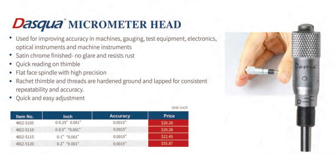 Dasqua 0-0.5" micrometer head is used for improving accuracy in machines, gauging, test equipment, electronics, optical instruments and machine instruments. Quick and easy adjustment. Flat, lapped face. High precision spindle. Easy to read. Satin chrome, low glare finish. Rust resistant. Ratchet thimble. Hardened ground and threads for consistent repeatability and accuracy. Accuracy is .0015".