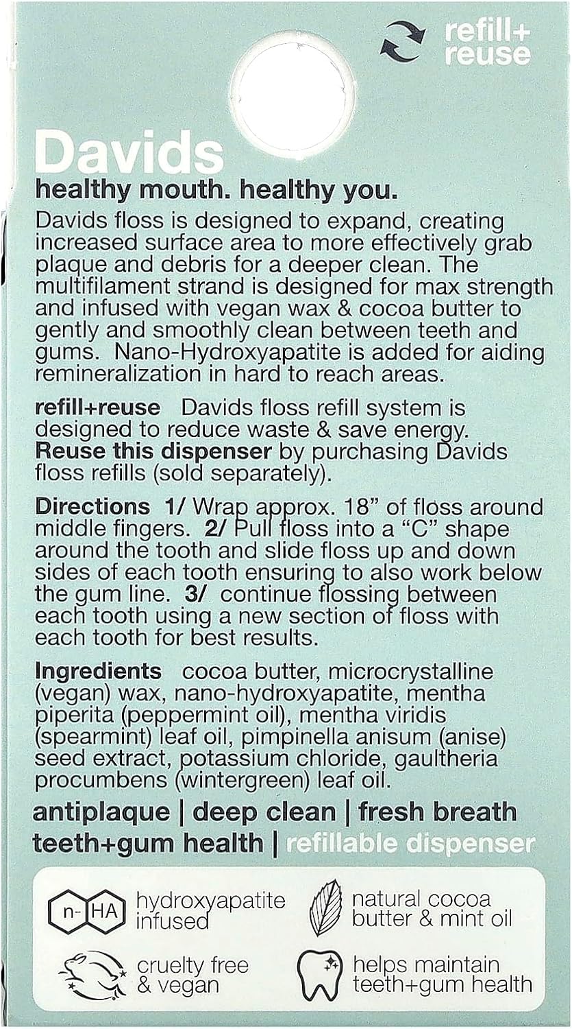 Davids' refillable floss system aims to minimize waste and conserve energy by doing away with single-use dispensers. The reusable plastic dispenser conveniently opens for installing refills (sold separately).