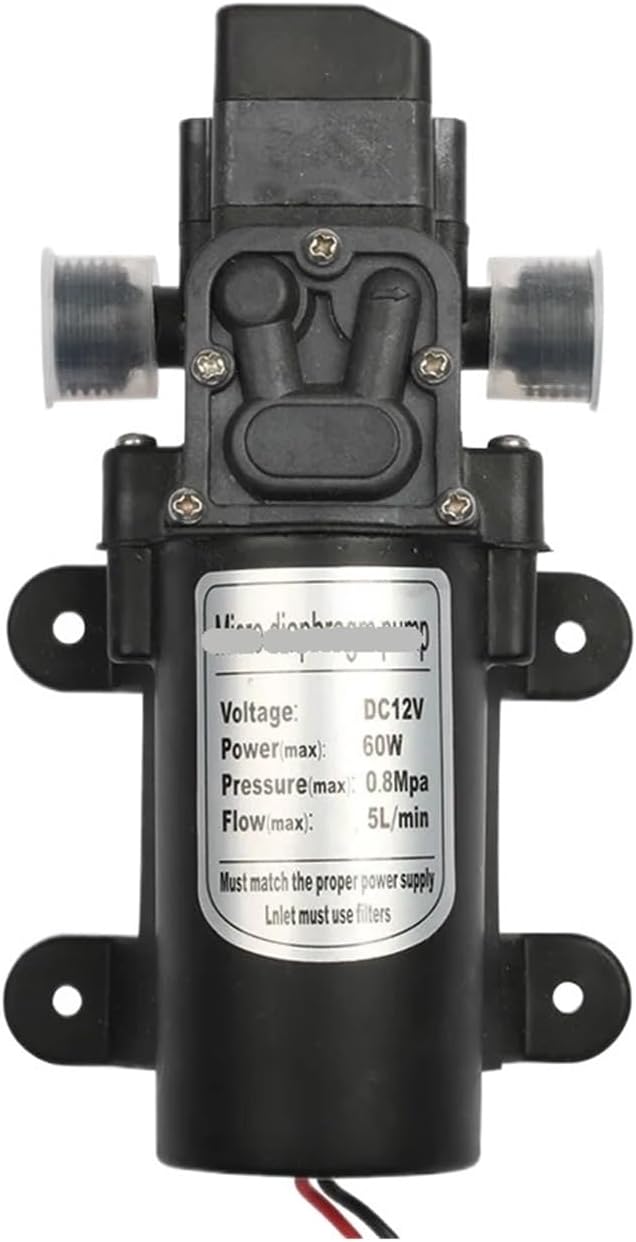 PumpsSpecifications: Power:electricalusage:waterapplication:Submersiblestructure:Diaphragm pumpsmodel:0142YA-12-60pressure:Low pressureStandard or non-standard:standardfuel:electrictheory:Diaphragm pumpsVoltage:12Vstrength:60WIntake pressure:0.2Mpapreset pressure:0.8MpaFlow rate (maximum):5L/minSuction distance:2 metersMotor life:3-5 yearssize:Approx. 16.5 x 9.5 x 6cm (L*W*H)