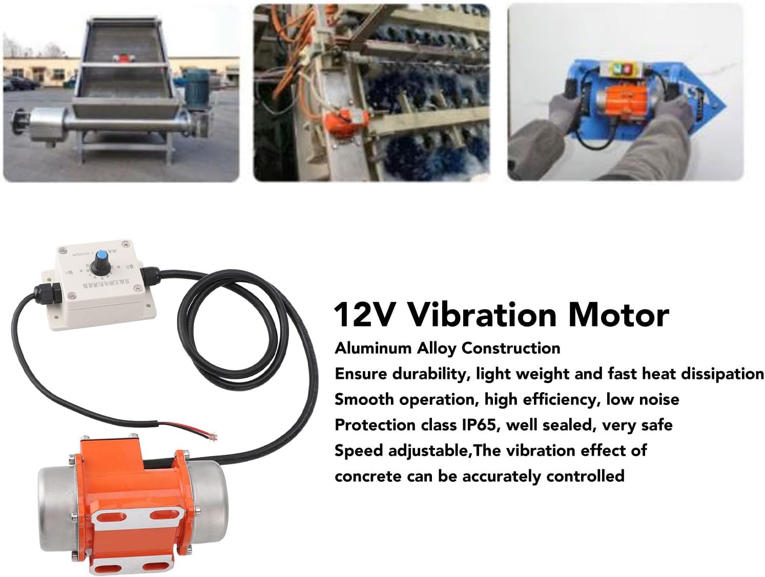 [Aluminum Alloy Material] Crafted from high-strength aluminum alloy for durability and longevity.[Simplifies Control motor speed and vibration force for uniform and dense concrete results.[Efficient and Low Noise] Lightweight and quick to dissipate heat, saving power and minimizing noise.[Adjustable Speed] Tailor performance to specific project requirements with speed adjustability.[Easy Installation and Usage] Easy wiring and installation with ip65 for maximum safety.Spec:Item Type: Brushless DC Vibration MotorMaterial: Aluminum alloyVibration Motor: Approx. 119.4 x 76 x 70mm / 4.7 x 3 x 2.8inGovernor: Approx. 90 x 60mm / 3.54 x 2.36in, installation hole spacing: Approx. 77 x 39mm / 3.03 x 1.54inType: Brushless DC motorApplication:Widely used in Mining, metallurgy, coal, electricity, construction, chemical, casting, food, powder coating equipment, powder screening, food machinery and other fields.The vibration motor is mainly suitable for equipment such as vibration tables, vibration feeders, vibration screens, and specific stone removal machines.Weight: Approx. 1002g / 35.3ozHow to Use:Install and use according to the appropriate voltagePackage List:1 x Brushless DC Vibration Motor