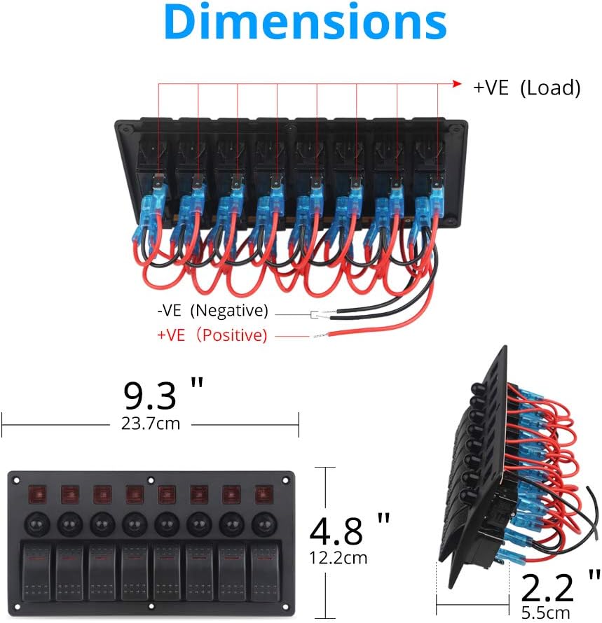 Specification : Material : Aluminium alloy + Plastic Size : 9.3 X 4.7 X 3.0 inch Weight : 0.9 Lbs Installation : Pre-wired Rocker switch : Loop circuit : ON - OFF Input voltage : DC 12V / 24V IP rating : IP65 Opertating temperature : -25 Celsius degree to 80 Celsius degree Feature : Prewired and easy to install , suit well for 12V and 24V car vehicle,yacht,ship,caravan,truck ,etc. Multifunction Switch Panel Kit:included 8 on-off Blue LED rocker switch with rubber seals, 8 circuit breakers, Four of 10A,Four of 15A,great for all types of circuit control, circuit breaker will automatically cut off the power supply and help keep the electrical appliances safe 8 rocker switches , controlling universal equipments in the vehicle : headlight,foglight,width light,car refrigerator , car vacuum , other automobile external equipments and so on. 8 Illuminated LED rocker switch ,matching well to vehicle and marine label , good for DIY. Contain : 1 X 8 Gang rocker switch panel 1 X sticker 6 X Screw