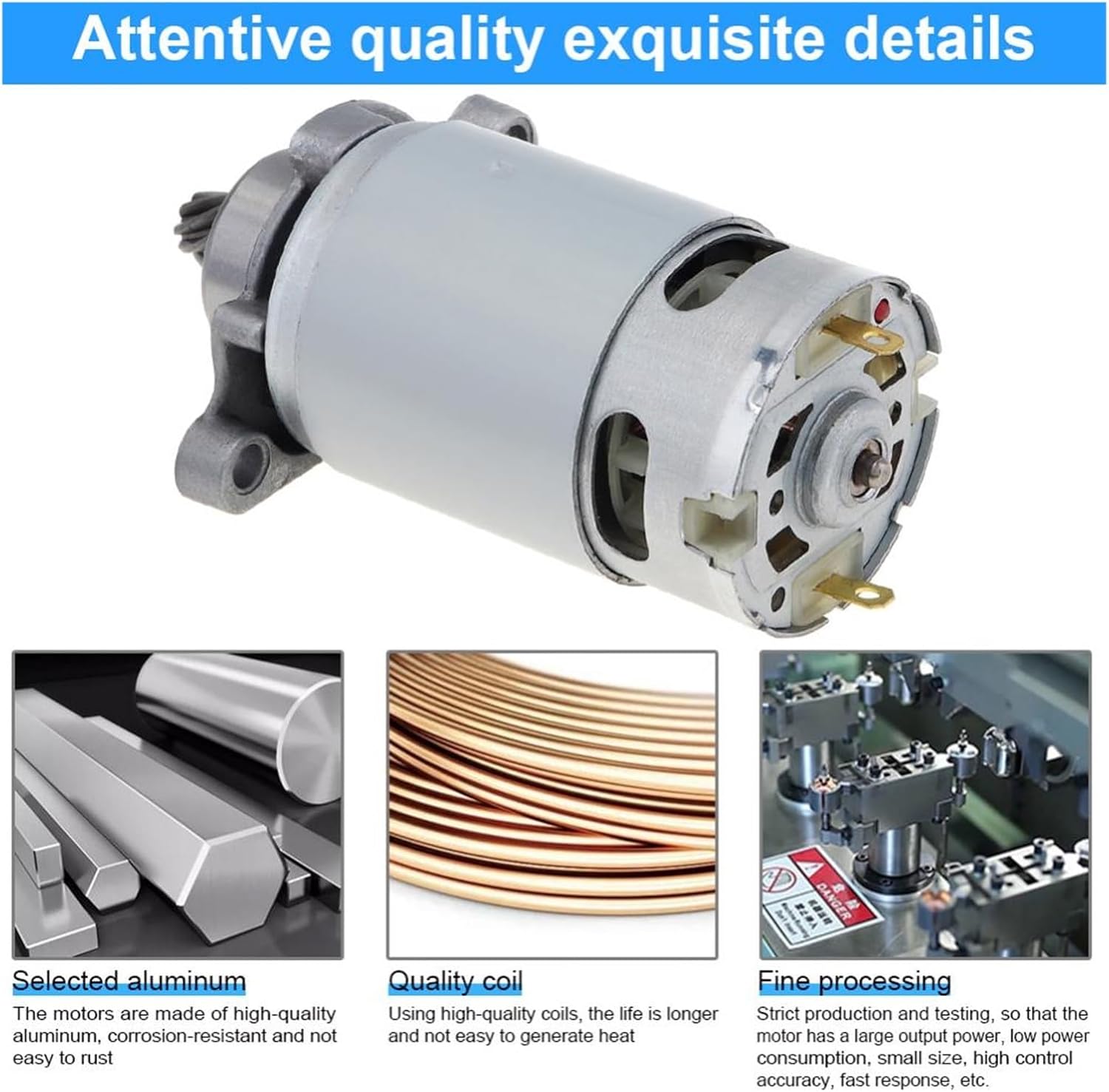 Motorsdescribe- Suitable for electric saber saws, reciprocating saws, hand-held lithium cutting saws, etc.- Front and rear double ball bearings, with heat dissipation impeller, stable speed.- Pure copper coil, strong continuous torque output, high speed, low noise, durable.- High-precision, high-strength gears, integrated motor, exquisite details, perfect fit, and durable.- 8 tooth 550 DC motor, perfect for rusty or damaged motors on power tools.