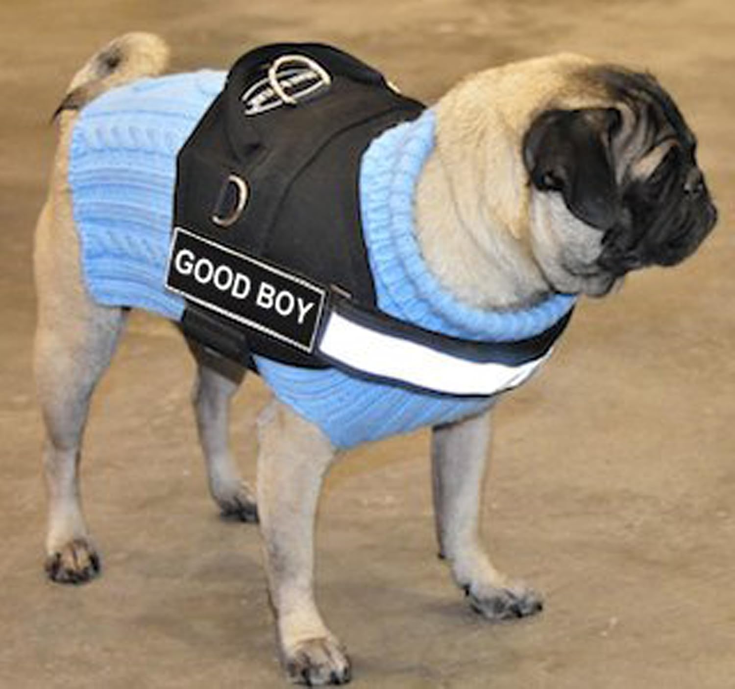 Dean & Tyler works fun harness with removable velcro patches "good boy", black, large, lightweight & comfortable, double ply neoprene nylon, release buckle, adjustable straps, made in Europe.