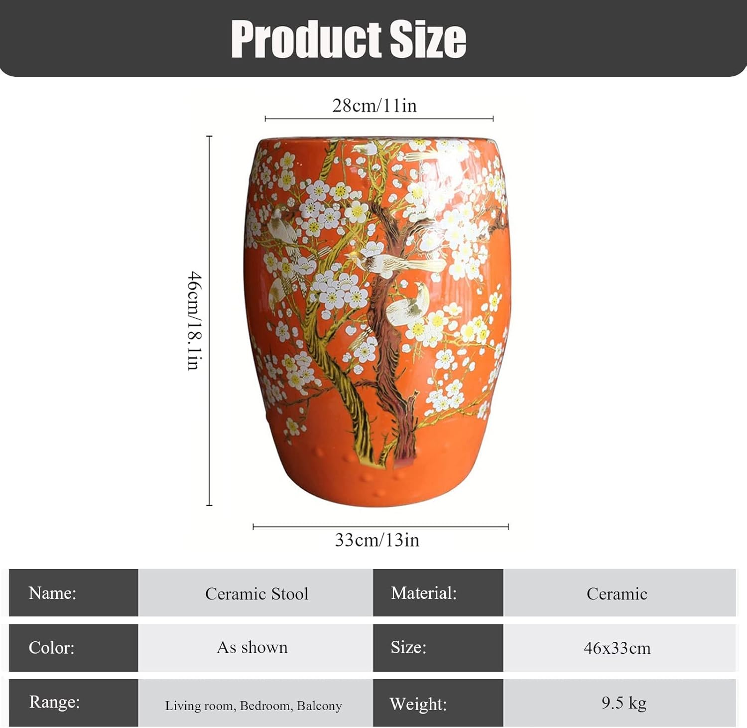 Name: Ceramic drum stoolMaterial: CeramicColor: As shownSize: 46x33cm/18.1x13inOrigin: Mainland ChinaPacking list:1 x Ceramic stoolPrevention:1. Due to different monitors and lighting effects, the actual color of the product may be slightly different from the color shown in the picture.2. Due to manual measurement, please allow the measurement deviation to be 1-3cm.3. In the process of production, there will be small black spots and pinholes, which is a normal phenomenon. Those who perfection should be careful.4. Do not use steel ball or hard objects to scratch when cleaning. It is normal to produce slight scratches when using metal knife and fork.Perfect for gardens, patios, decks, sunrooms, greenhouses or anywhere in your home where you want to add a fresh touch.