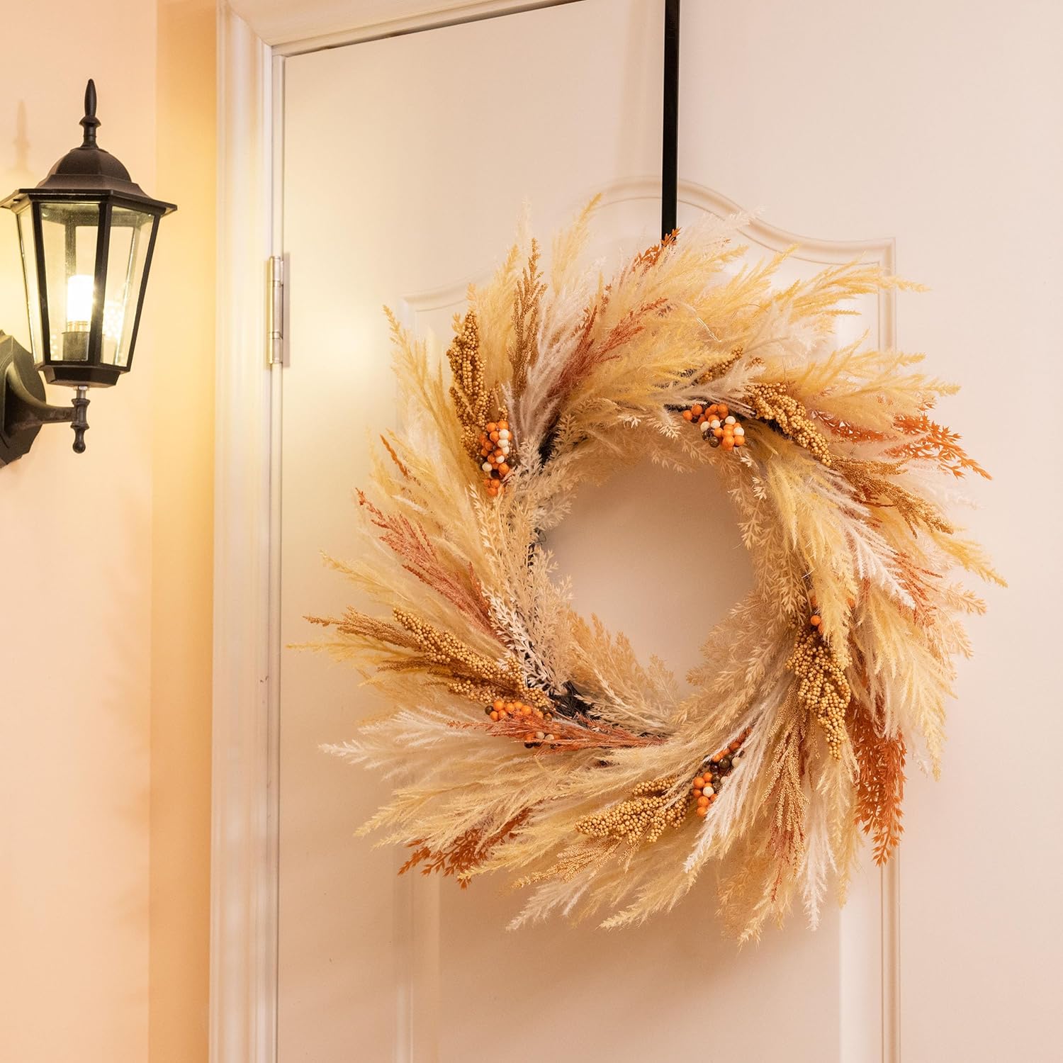| Material | Artificial materials (such as silk or polyester) and possibly some metal components for the base small berries, colorful leaves different sizes pumpkins. |