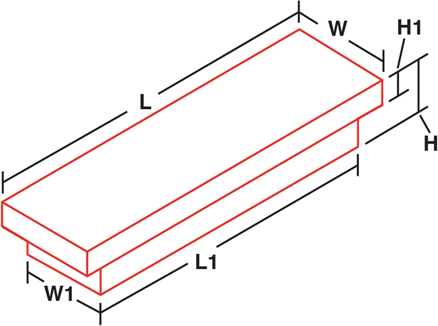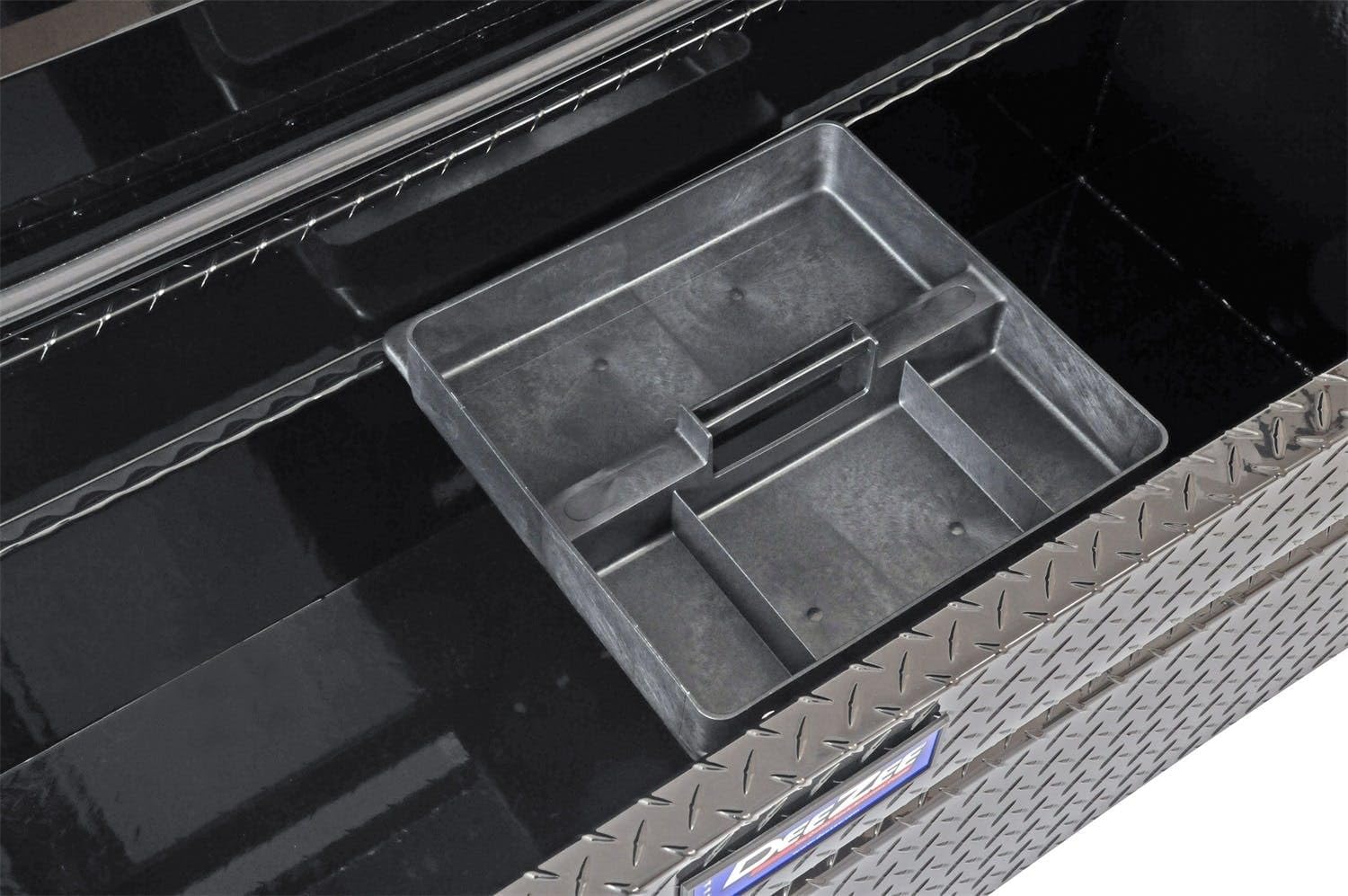 Dee Zee Tool Box - Blue Label (Contractor Grade) Single Lid Crossover. Constructed of heavy gauge Brite-Tread aluminum. Black Tread powder coat, provides a gloss black finish while it protects and prevents oxidation. Large push button with self-adjusting latches. Hidden hinge, gas shocks, Alumaguard strengthening channel, and adjustable strikers on a hat style lid. Removable plastic tool tray to help keep small items organized.