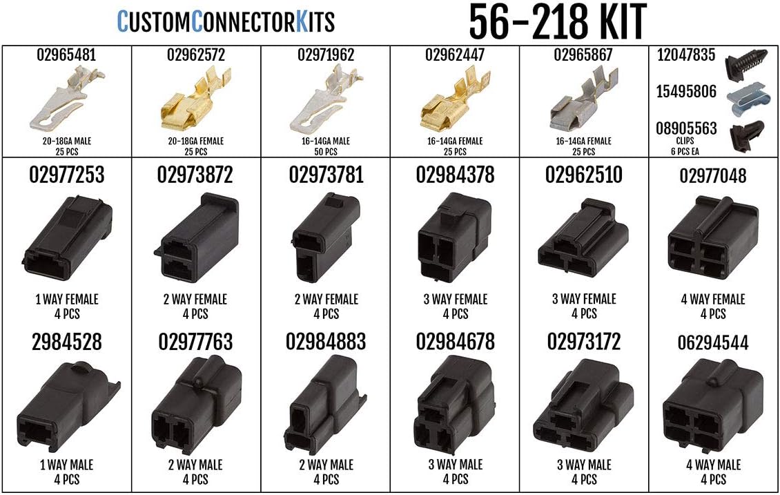The 56 Series by Delphi Packard was introduced in 1956, and quickly became the most widely used in the automotive industry. Our 56-218 kit features the most commonly used connectors, terminals, and clips from the series. This kit contains enough connectors to create 24 connector assemblies, for a total of 60 individual connections. Great for restoration projects!