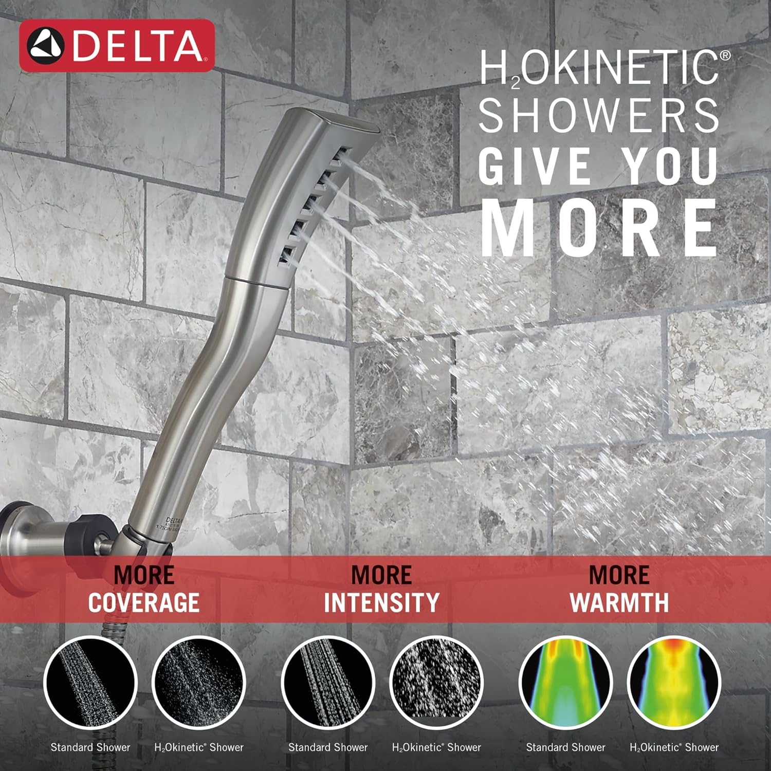 Experience a better shower with the control and flexibility of a Delta® hand shower. Great for showering yourself or your loved ones and pets, as well as for keeping your shower and tub clean. Delta® H2Okinetic® Showers look different because they are different. Using advanced technology, H2Okinetic showers sculpt water into a unique wave pattern, giving you 3X the coverage of a standard shower head.* The end result is a shower that provides more coverage, more warmth and more intensity for a truly drenching shower experience. So go ahead and indulge, because now you can enjoy the feeling of more water without using more water. Delta WaterSense labeled faucets, showers and toilets use at least 20% less water than the industry standard—saving you money without compromising performance. *Coverage measured in accordance with EPA WaterSense® Specification for shower heads, March 4, 2010.