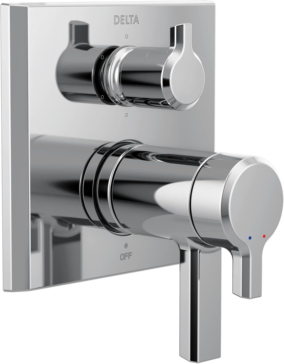 The confident slant of the Pivotal® Bath Collection makes it a striking addition to a bathroom’s contemporary geometry for a look that makes a statement. Delta® showers with Monitor® pressure-balance valves are engineered to make sure you don’t experience a sudden and possibly unsafe change in water temperature as a result of running water elsewhere, such as using a dishwasher, flushing a toilet or running a washing machine. By integrating separate controls on one trim with the MultiChoice® Integrated Shower Diverter, we’ve streamlined installation and your shower style. With the MultiChoice Universal system, you have the freedom to upgrade style and functionality later. And, because there’s no need to alter plumbing behind the wall, you save time, effort and money on future renovation updates. With separate volume and temperature control on this model, simply set the water at your preferred temperature and turn the shower on or off with the volume control handle — without interrupting your set temperature. You can install with confidence, knowing that Delta showers are backed by our Lifetime Limited Warranty.