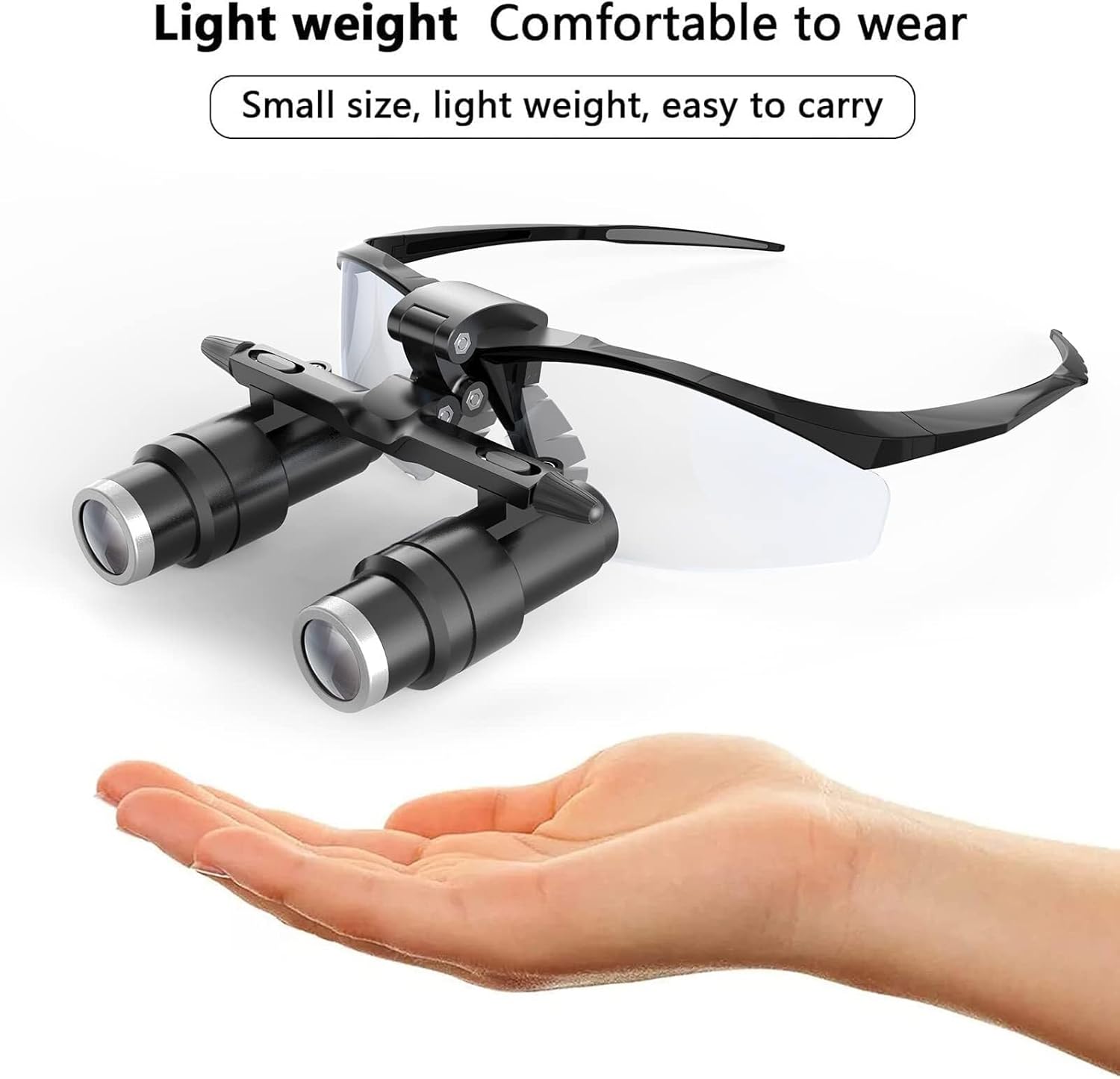 The Dental Medical Magnifier Loupes are designed for professionals and hobbyists who require magnification for precise and detailed work. With magnification options of 4.0X, 5.0X, and 6.0X, and a working distance range of 340mm to 500mm, these loupes are perfect for use in dentistry, surgery, jewelry, and hobby crafting.Key Features:Adjustable Nose Bridge: Tailor the fit to your needs with an adjustable nose bridge, ensuring comfort during long hours of use.Flip-Up Design: Convenient flip-up mechanism allows easy switching between magnification and normal vision, ideal for operations and repairs.Customizable Viewing Angle: Fully adjustable viewing angles and inter-pupillary distance adjustments ensure a perfect optical alignment, enhancing focus and reducing strain.Optical Glass: Made from multi-coated optical glass for superior image clarity and a large field of view, providing a distortion-, detailed view for all types of detailed work.& Comfortable: The lightweight design (only 140g) combined with the adjustable headband makes these loupes comfortable for extended use.Specifications:Magnification: 4.0X, 5.0X, 6.0XWorking Distance: 340mm, 420mm, 500mmField of View: 50mmPupil Distance: 54mm - 68mmDepth of Field: ±30mm at standard working distanceLoad Weight: 140gColor: BlackPackage Size: 190 x 130 x 100mmPackage Contents: Loupes + Duster Flannel Bag + Paper BoxThese loupes are the perfect choice for professionals and hobbyists alike. Whether you're performing dental surgeries, repairing clocks, engraving miniatures, or working on jewelry, these head-mounted magnifying glasses will provide you with the clarity, comfort, and precision needed to complete your tasks efficiently.