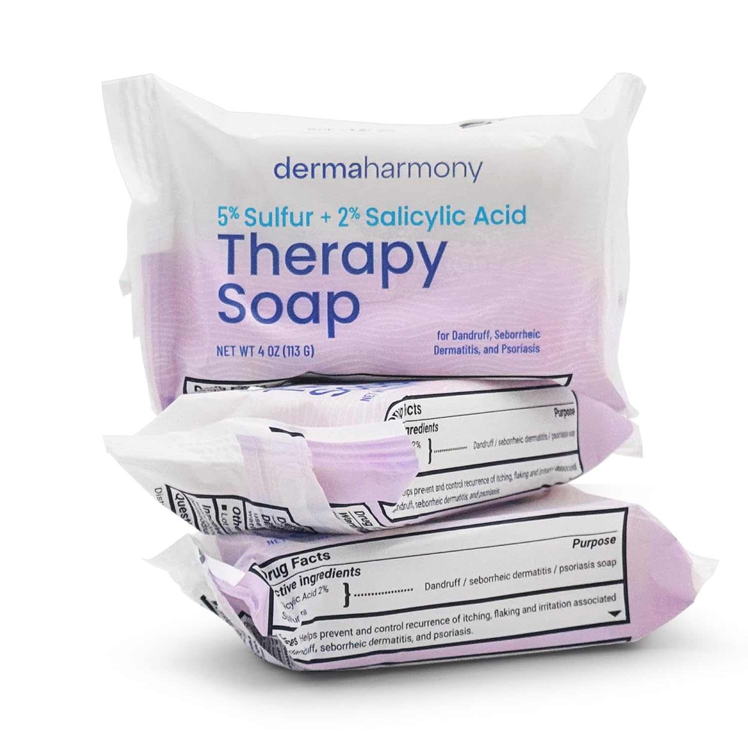 SIZE:Five 4 oz. barsDermaHarmony 5% Sulfur and 2% Salicylic Acid Body and Facial Soap helps prevent and control recurrence of itching, flaking and irritation associated with dandruff, seborrheic dermatitis, and psoriasis. The soap, a registered OTC drug, is safe for daily use by adults and children. We've kept the ingredients as natural as possible (see ingredients list below).ACTIVE INGREDIENTS: 5% Sulfur, 2% Salicylic Acid. INACTIVE INGREDIENTS:Sodium Palmate, Sodium Cocoate*, Sodium Palm Kernelate*, Water, Glycerin (from vegetable oil), Soyethyl Morpholinium Ethosulfate (soy-derived), Sodium Chloride (salt), pentasodium perdelate. *May contain this ingredient. DIRECTIONS: For best results use daily or as directed by your doctor in place of your regular soap. Work up a later using warm water and gently massage into affected areas. Leave in contact with skin for at least 30 seconds. Rinse well. For best results use at least twice a week. In case of accidental ingestion, contact a physician or poison control center immediately. Because some customers experience a drying of their skin when using this soap, start with one application and then gradually work-up to daily application. If bothersome dryness or peeling occurs, reduce application to once a day or every other day. You may follow cleansing with the natural moisturizer or conditioner of your choosing. If using as a shampoo, the bar will not perform well with hard water.MANUFACTURED BY: DermaHarmonyNo artificial colorNot tested on animals (Vegan)Fragrance freeMade from responsibly sources and sustainable natural oilsMade in the USA