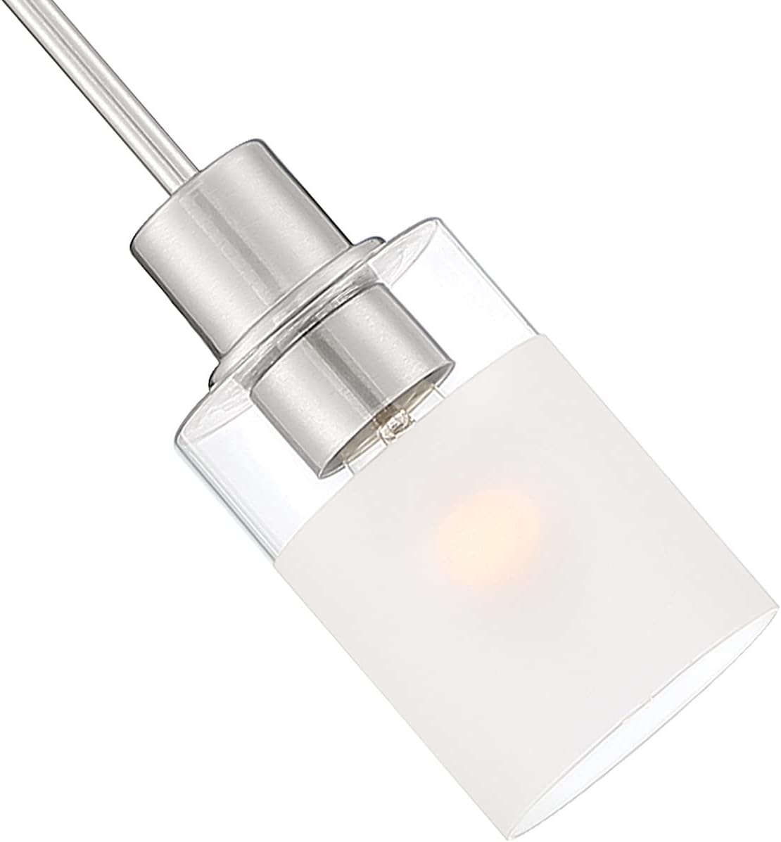 The DESIGNERS FOUNTAIN Cedar Lane Pendant Light adds a touch of modern elegance to any space with its brushed nickel finish and distinctive clear and etched glass shade that casts soft, ambient light. Perfect for kitchens, dining rooms, entryways, and hallways, this steel pendant comes with two 6-inch and two 12-inch rods for customized hanging up to 43.75 inches and is compatible with 45-degree sloped ceilings. Measuring 4 x 4 x 7.75 inches, this fixture supports a single medium base 60W max bulb (not included), offers dimmer compatibility for adjustable lighting, and is UL certified for dry indoor use with a 1-year warranty.