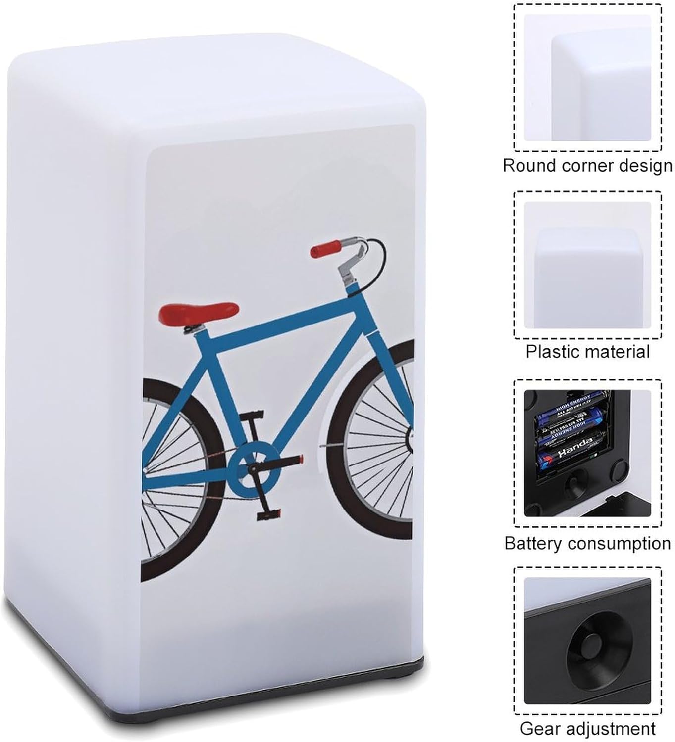 Made of durable plastic, this Bicycle Schematic printed small bedside table is a must-have for modern living. It features dual brightness adjustment. When you stay up late reading in your study, switch to the high setting for crisp, bright light. In the bedroom, the low setting provides a soft glow to guide you on your nighttime errands without disturbing your sleeping partnerThis mini lamp has uses beyond the home. In bars and cafes, its warm, inviting light creates a welcoming atmosphere that keeps customers coming back for more. In the kitchen, it provides the lighting for a late-night snack, and on your desk, it ensures you have light while you work or studyDesigned with portability in mind, this cordless lamp is easy to move with its lightweight construction and battery operation. Whether you're rearranging your living room, working in the garden, or traveling, it'll light your way. Simply load up with 3 AAA batteries (not included) and you're ready to goNot only is it powerful, its sleek design makes it a stylish addition to any room. It blends in with a variety of home decor, serving as both a lighting source and an elegant decorative pieceThis table lamp is an ideal gift. Its classic long shape and practical functions make it a great gift for friends and family on birthdays, holidays or any special occasions