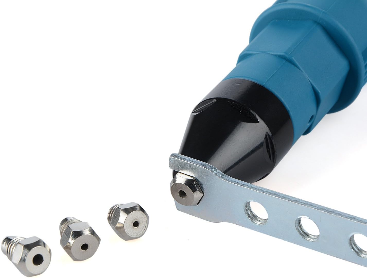 Features:1. Replace the traditional welding nuts, make up the metal sheet, thin tube welding fusible, welding nuts and other missing.2.Excellent ergonomics, quick release and installation,great strength and great added features.Specification:Color: black,blueFunction: rivetingNozzle size: 2.4mm, 3.2mm, 4.0mm, 4.8mmPackage Include:1x Riveting Tool2x Wrench3x NutsMethod of operation:1. Pick the right size opening for your rivet, there are 4 to choose from.2. Attach the tool to cordless drill.3. Hold the tool, before it starts to grab the rivet, hit reverse on your drill until you feel click. The rivet can be fitted in once the teeth widen.Put the rivet in the tool and slowly hold the handy part of the tool and pull the drill trigger, when you feel it start to grab the rivet.4. put it in the hole that you wish to rivet and keep holding the handy part and hit the drill at full.5.Once the rivet pops, keep holding the handy part of the tool and hit reverse on your drill.6. The teeth will widen and the old rivet shaft will drop to the ground. Put your drill back in the forward position and rinse and repeat.