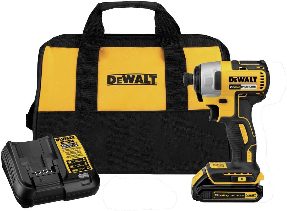 This Brushless Impact driver has a compact lightweight design and bright LED for working in dark or confined spaces. With up to 1,500 in-lbs. of torque this impact driver provides the power you need to complete a wide range of applications. The handle features an ergonomic design for balance and easier tool control. This cordless kit includes our most powerful, most compact, and lightest weight 20V MAX* battery**, with 50% more power, 25% more compact, and 15% less weight than the DCB203** . The DEWALT POWERSTACK™ compact battery works with all DEWALT® 20V MAX* power tools and chargers.