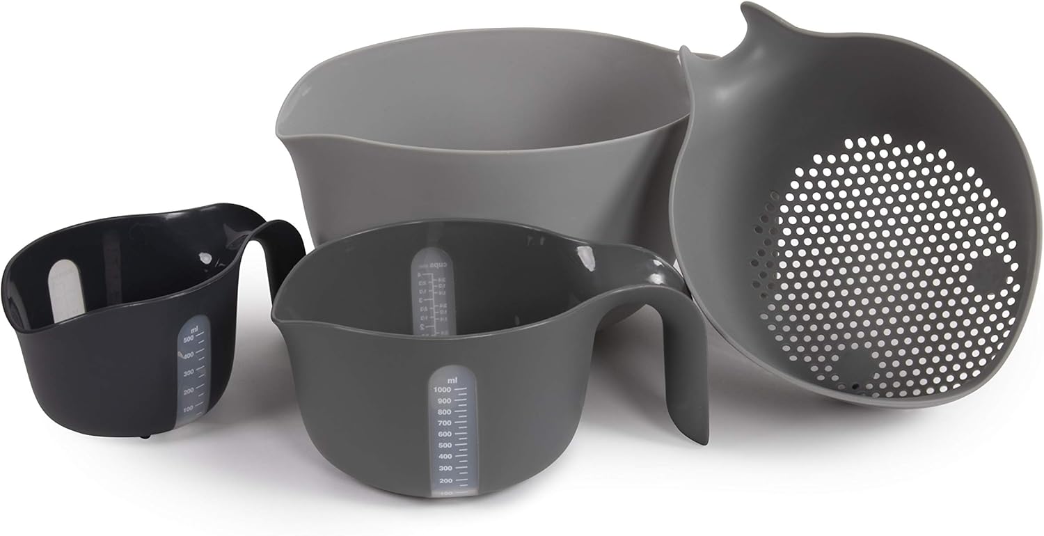 Dexas mixes it up with this complete set of mixing bowls with over-sized handles for stability and ease of use while mixing and pouring. Measure, mix and pour ingredients for cakes, pancakes, muffins and more. The set nests together for storage and comes with a bonus colander. The two smallest bowls have a see-through measuring guide. High sidewalls prevent splatter while beating or mixing, with wide spouts for drip-free pouring. The large outer bowl has a capacity of over 12 cups (3+ quarts).