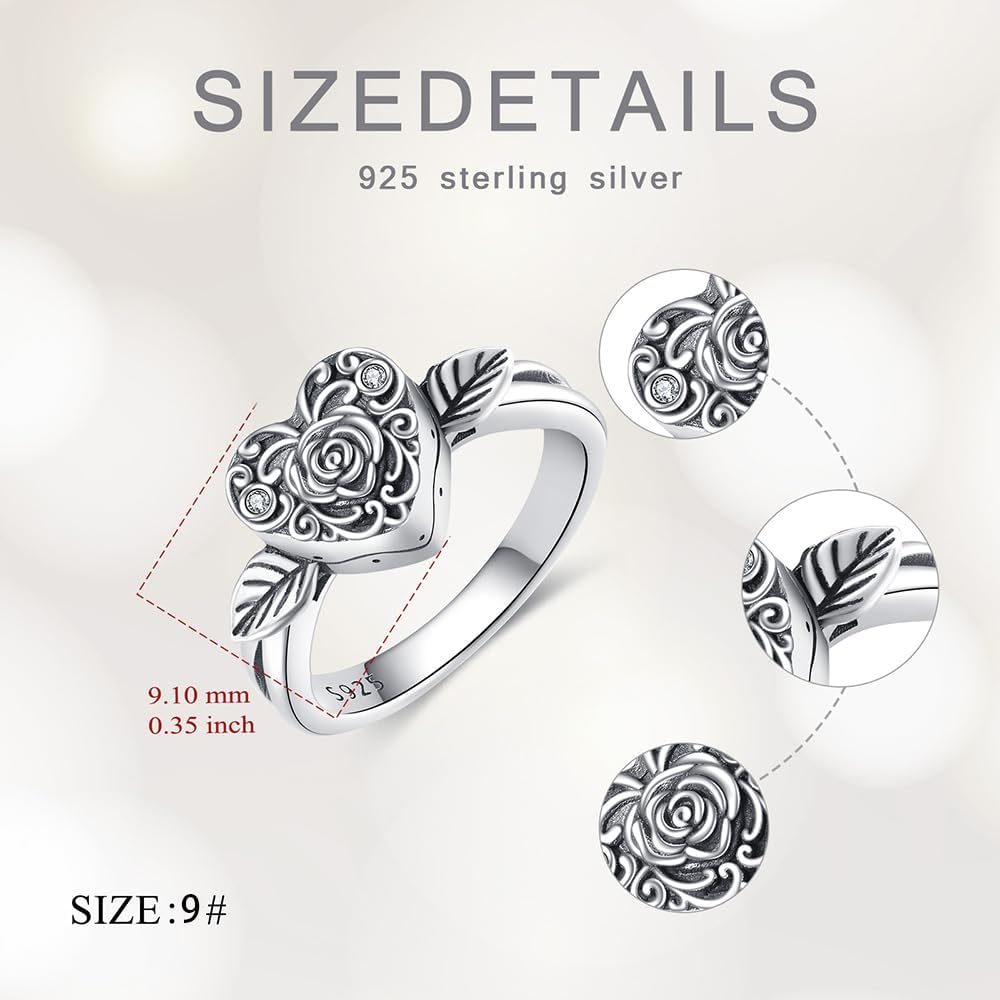 Diamond Rose Flower Cremation Urn Ring for Women 925 Sterling Silver Vintage Leaf Vine Memorial Rings Keepsake Jewelry with Filling Tool for Animal Human AshesRoses represent warm and sincere feelings, and symbolize "I love you" and eternal commitment. This 925 silver rose urn ring is designed for those who have lost a loved one or want to treasure something forever. It is suitable as a gift of encouragement or blessing. There is a switch design on the top of the heart, which can be used to place hair, perfume, ashes, dried flowers, etc. to help you remember your deceased loved ones.Ring Details: Highly polished finish,nickel-free,lead-free,hypoallergenic and cadmium-free for sensitive skin.Suitable for many occasions:Mother Gift Wife GiftGrandma GiftDad GiftFamily GiftBest Friend GiftGraduation GiftSister GiftFuneral GiftChristmas GiftThanksgiving Day GiftEaster GiftAnniversary GiftS925 silver rose urn ring for ashes: Material: 925 sterling silverColor: Silver Oxide Effect Comes with a beautiful gift box.