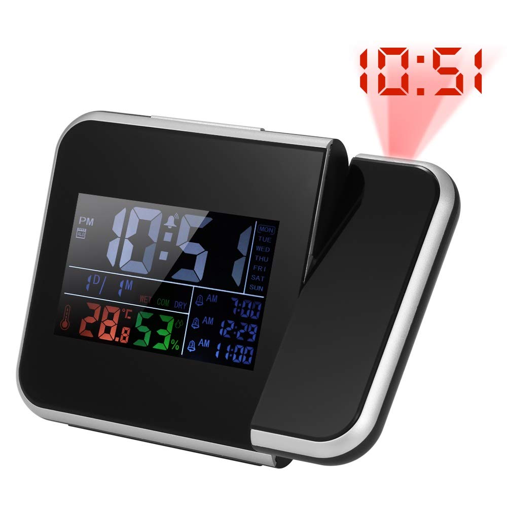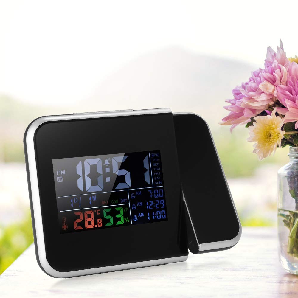 Material: ABS Color: BlackTemperature Measuring Range: 0~50°C / 32~122°F Temperature Accuracy: ±1°C , testing once 30 secondsHumidity Measuring Range: 20%~99%RHHumidity Accuracy: ±5%RH, testing once 30 secondsFunction: Time Display, Week Display, Date Display, Temperature & Humidity Display, 3 Alarm Clock Display, Time Projection, Snooze, Comfort Level, 3 Adjustable Lightness for 4.5V/5V PowerEffective Distance of Projection Display: 0.5~4 MetersPower Supply: 4.5V/5V OR 2 * 1.5V AAA Batteries(Not Included)Length of AC/DC Adapter: 1.2m / 3.94ftInput Voltage: AC 110-240VOutput: 4.5V/5V 1AItem Size: 150 * 60 * 110mm / 5.9 * 2.4 * 4.3inItem Weight: 160g / 5.6ozPackage List:1 * Temperature & Humidity Projection Alarm Clock1 * User Manual1 * AC/DC AdapterNote:Light shooting and different displays may cause the color of the item in the picture a little different from the real thing. The measurement allowed error is +/- 1-3cm.