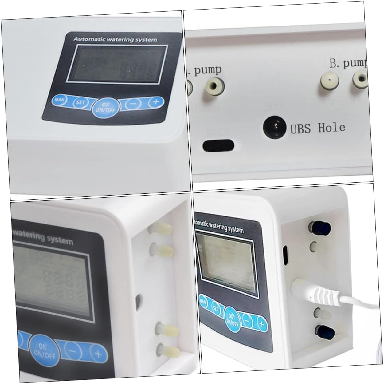 Package List 1 x watering timer 1 x USB cable 1 x solar panel Characteristics - Material: ABS irrigation controller. - Input voltage: 4.2V-5V automatic watering controller. - Interface type: micro USB digital water timer. - Battery voltage: 3.7V irrigation timer. - Waterproof grade: PI67 rainproof solar watering timer. - Motor power: 5W timing watering device. - With "hour" mode: watering time 0-9999s, cycle time 1-999h. In the "day" mode: watering time 0-9999s. Strong practicality. Suitable for home and garden use watering device. - Pump flow: 850ml/min. - Color: As Shown. - Size: 12.00X8.90X4.30cm/4.72X3.50X1.69in - Battery capacity: 1200 mAh. - Rainproof, sun-proof, drop-proof, low-consumption and energy-saving, long standby time of 60 days watering controller. - Silent pure copper motor, quiet and . Equipped with large digital display screen for easy reading watering timer. - Made from ABS material, it is and , which supports USB and solar dual-mode charging double pump watering timer. - Double pump water supply, which can be switched to single pump. You can adjust the output water size to meet the needs of different flowers.Goods Descriptiondouble pump watering timer Made of material, it is for long time use.watering controller This is a double pump watering timer for your flower and plants.solar watering timer You can set the watering time arbitrarily, which is for home and garden use.watering timer Large screen display makes it very convenient for you
