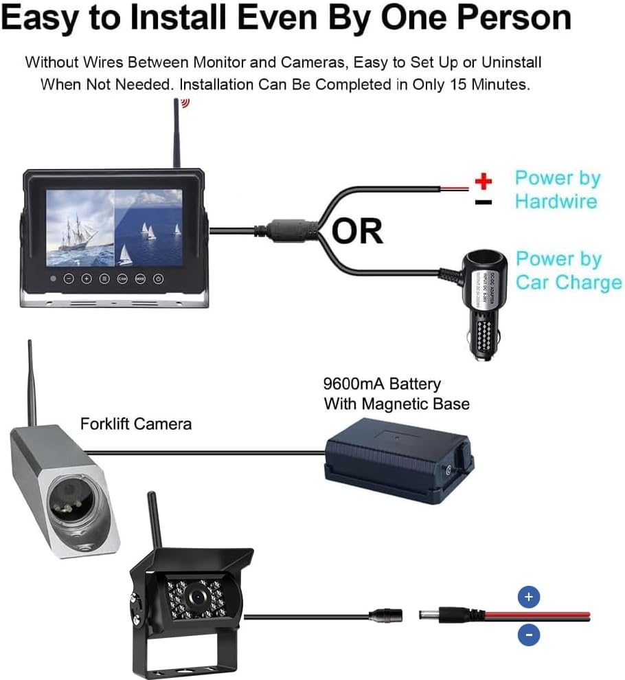 Main Features: * Support 2CH wireless camera and wireless transmitter. * Waterproof; with built-in antenna. * Support multiple display modes, such as Full Screen-view mode, dual split screen view mode, display mode can be set flexibly. * Supports both manual and automatic pairing. * Supporting 1080P camera input. * Digital Wireless kit makes its working range can be up to 50-100m. * Large Screen- 7 Inch Size, bring you more clear and vivid picture for forklift working security. * 9600mA Battery with Magnetic Base, easy installing; with USB cable for charging. * Magnetic housing for wire-free installation. Just simply place the magnetic forklift camera on the iron arm, and the camera can firmly attach to the forklift. * IP69K Waterproof wireless camera, suitable for outdoor use Why install Split screen 1080P HD IP69K waterproof camera wireless forklift reversing camera with battery power bank system? How to avoid accidents in warehousing operations caused by limited visibility? How to improve the working efficiency of the forklifts with safety being guaranteed? How to prevent secondary damage by the collapsed goods or shelves resulted from the vision error of forklifts? 1080P HD IP69K waterproof camera wireless forklift reversing camera with battery bank system can help you solve your worries! Can’t be easier——How to install Split screen 1080P HD IP69K waterproof camera wireless forklift reversing camera system? Mount the forklift camera onto the fork arm and the monitor onto the cab, which offers the operators with clear front view. Save complex installation procedures, cutting installation costs 7 Inch screen Monitor with 1080P HD IP69K waterproof camera wireless forklift reversing camera system can be powered by an external battery, with no need for additional power wiring. Package Included: 1x 7 Inch Monitor 1x Antenna 1x Mounting Bracket 1x Cigarette Lighter Charger with USB Ports 1x Power Cable for monitor 1x Forklift Camera with Magnetic Base 1x Rear View Camera 1x Power Cable for Rear Camera 1x Battery Bank with Magnetic Base
