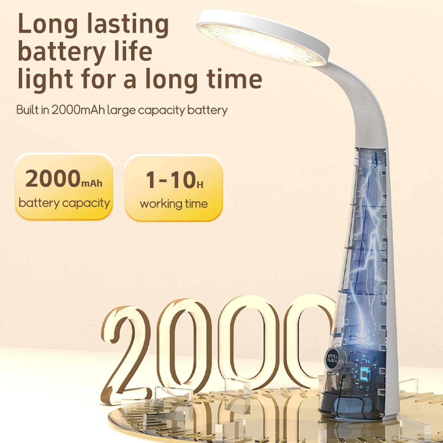 1. EYE PROTECTING: This LED desk lamp is equipped with 32 energy saving LED beads, providing comfortable lighting with no flicker or glare. The desk lamps for home office with two adjustable brightness levels can relieve eye strain from long hours of studying, working, or reading. This 6W cordless desk lamp has a built in 2000mAH battery which ensures up to 10 hours of lighting before needing to be recharged 2. MINIMALIST DESIGN: The gooseneck desk lamp can be adjusted to the proper angle using a flexible silicone hosepipe lamp arm. The base of LED desk lamps has a small footprint, easy to fit any environment from home offices to living rooms, cafe tables, bedrooms, and dorm rooms 3. NICE Gifts: With a beautiful package, this LED desk lamp makes the nice Gifts suitable for any occasion, such as Birthdays, Mother Day, Back to School, and Xmas 4. COMPLETE FUNCTIONS: LED desk lamp supports a variety of functions such as endless luminosity adjustment, angle adjustment, timing setting, etc., for your convenience 5. POWER SUPPLY: Home office LED desk lamp uses a li ion battery 2000mAh(built in), or DC 5V power supply, charging and plug use. Power for 6W, energy efficient Spec: Item Type: LED Desk Lamp Model: DX01 Material: ABS and silicone Adjustable Angle: 120° Voltage: 5V 2A Power: 6W Power Supply: 1 x Li ion battery 2000mAh(built in) or DC 5V power supply Features: Stepless light strength adjustment, angle adjustment, timer setting packing list: 1 x Desk Lamp 1 x Supply Cord 1 x User Manual
