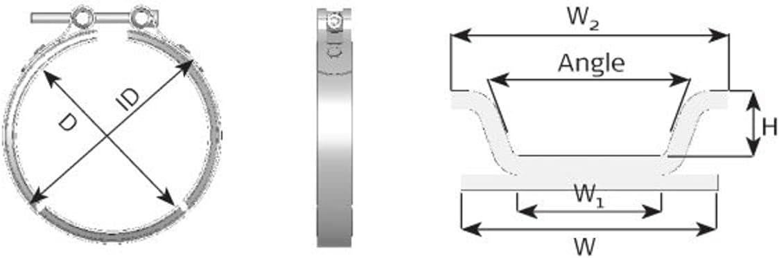 Material: Stainless Steel, Width 2 [mm]: 18, Width (mm): 25, Width: 1 (mm): 9.2; Height (mm): 8; fastening angle (degree): 40; Diameter [inches]: 4 1/2; inner diameter (mm): 45; Diameter: 142 mm.