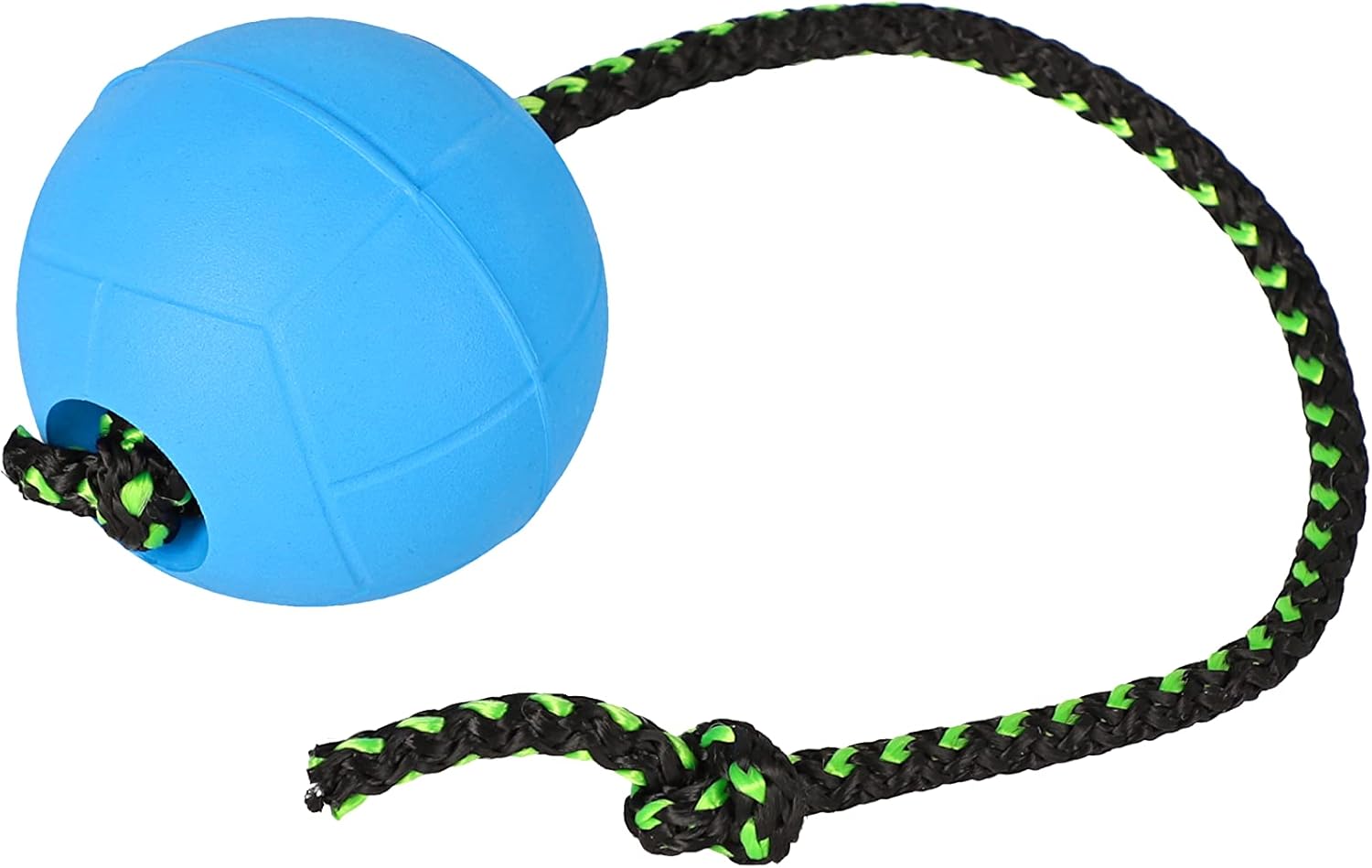 Dog ball made of rubber with a 30 cm handle for fun and various forms of training, also in water. The toy is hollow inside, with a hole for a string, which is pulled inside the ball and fixed on the other side. Thanks to this, the grip is firm, so you can use the toy for tug of war, grip and obedience training. There are shallow hollow grooves on the surface of the ball and one convex rubber line in diameter for a better grip for the dog. Colorful toys for dogs and other pets are made by Dingo in Poland.