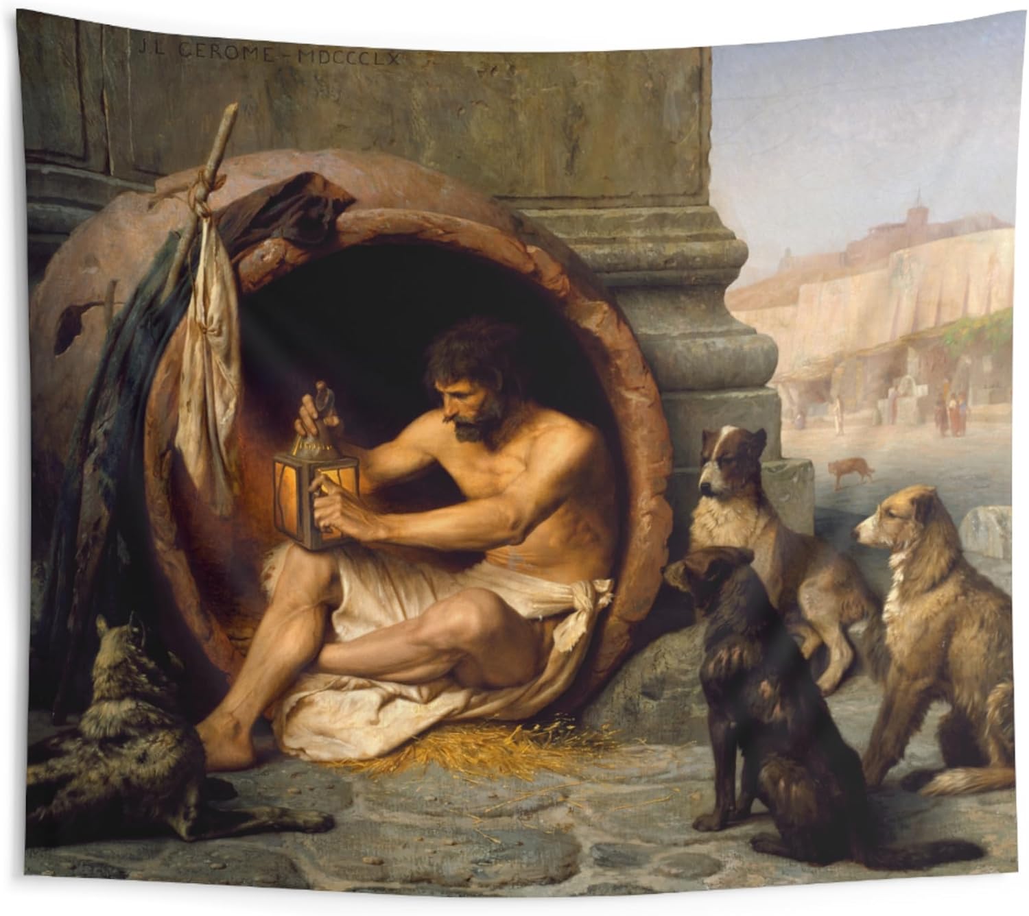 Bring the Philosophical Depth of Ancient Greece into Your HomeTransform your space with the Diogenes Tapestry, inspired by the iconic painting of the Greek philosopher in search of an honest man. This captivating piece depicts Diogenes in his earthenware tub, lighting a lamp. With vibrant colors and intricate details, this tapestry embodies the essence of philosophical thought and classical art, making it a perfect addition for those who admire history, art, and intellectual pursuits.🌿 High-Quality MaterialMade from 100% durable polyester, this tapestry is designed for both beauty and longevity. The hemmed edges provide a polished finish, ensuring a refined look and added durability.🌈 Vibrant Colors & DetailAdvanced printing techniques bring this artwork to life with bright colors and sharp detail. Every aspect of the painting is captured, allowing you to appreciate the artistic mastery of this classical scene.🎁 Perfect GiftThis tapestry makes a thoughtful and meaningful gift for lovers of philosophy, art enthusiasts, or anyone who admires classical history. Its intellectual appeal and aesthetic beauty make it a cherished addition to any decor.🏛️ Versatile DecorIdeal for enhancing your living room, study, or office, this tapestry adds an element of historical elegance and sophistication. It’s a perfect choice for those looking to create a space that celebrates the intellectual and the timeless.🧼 Easy CareKeep your tapestry looking fresh with simple care instructions. Machine washable on a gentle cycle, it can be tumble dried on low or hung to dry to maintain its vivid colors and quality.