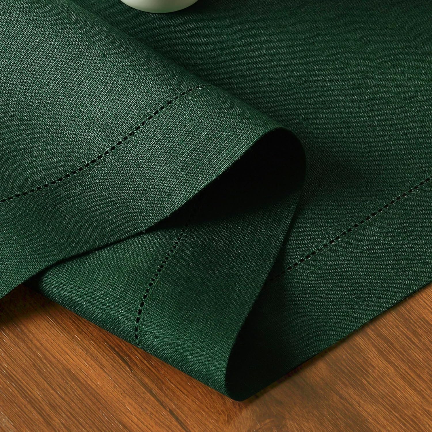 VALUE PACK - This pack contains 4 Forest Green Linen Napkins (20 x 20 inch) and 1 Forest Green Linen Table Runner (14 x 108 Inch); 5 pcs in total; handcrafted by specially trained artisans in small batches. PREMIUM EUROPEAN LINEN - These forest green dinner napkins and table runner are made from 100% European flax linen, not blended with cheaper materials like cotton or polyester. Pure linen is an exceptionally durable midweight, hypoallergenic (good for people with allergies) fabric which outperforms cotton in tensile strength and abrasion resistance.