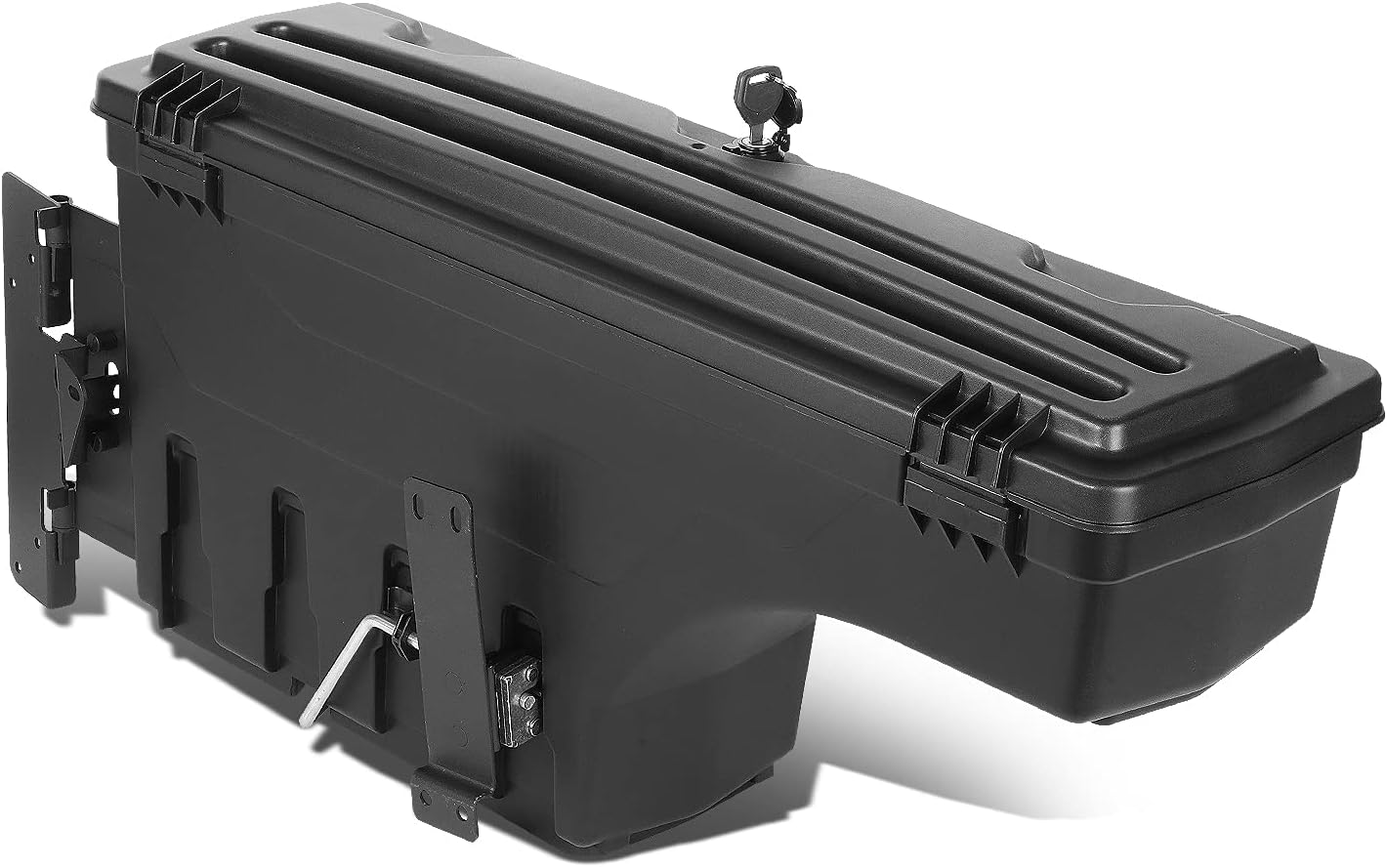 Secure, transport, and access your belongings in your truck bed easily. This wheel well box is made out of heavy duty abs plastic and is locked and weather sealed. The mount has a eyelet to install a lock to secure to the bed and the box can swivel out for easy access with the pull of the bottom handle.
