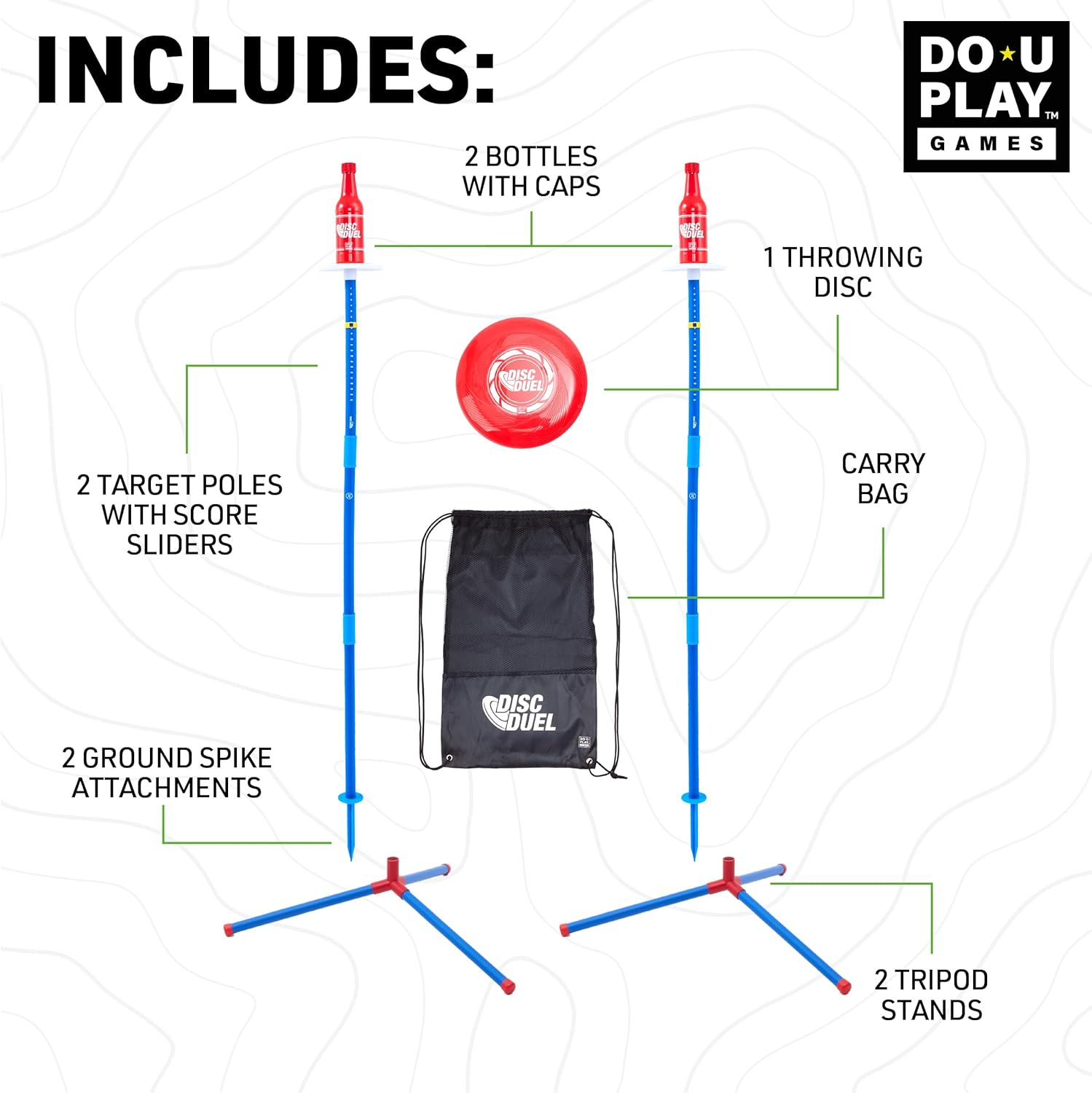 | Included Components | 1 x Throwing Disc,2 x Bottles with Caps,2 x Trays,2 x Score Sliders,12 x PVC Poles,6 x Connectors,6 x Caps,2 x Ground Spike Attachments,1 x Carry bag |