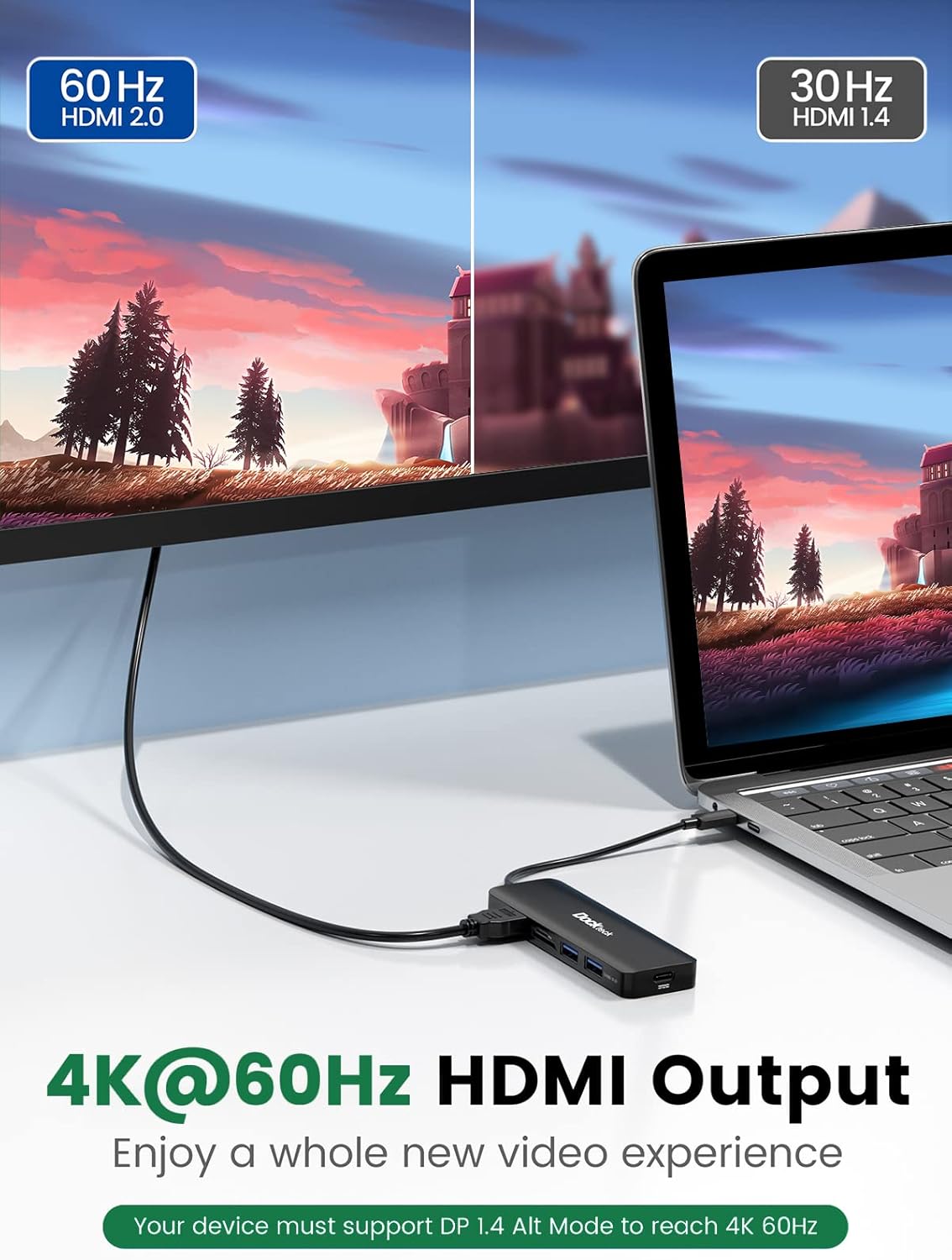 Devices that support 4K at 60Hz: MacBook Pro 2023 16" / 2022 M2 13" / 2021 / 2020 13" M1 / 2019 / 2018; MacBook Air 2023 M2 15" / 2022 M2 / 2020 M1 / 2020 13" / 2019 / 2018; iPad Pro 12.9" 11" M2 2022 / M1 2021 / 2020 / 2018